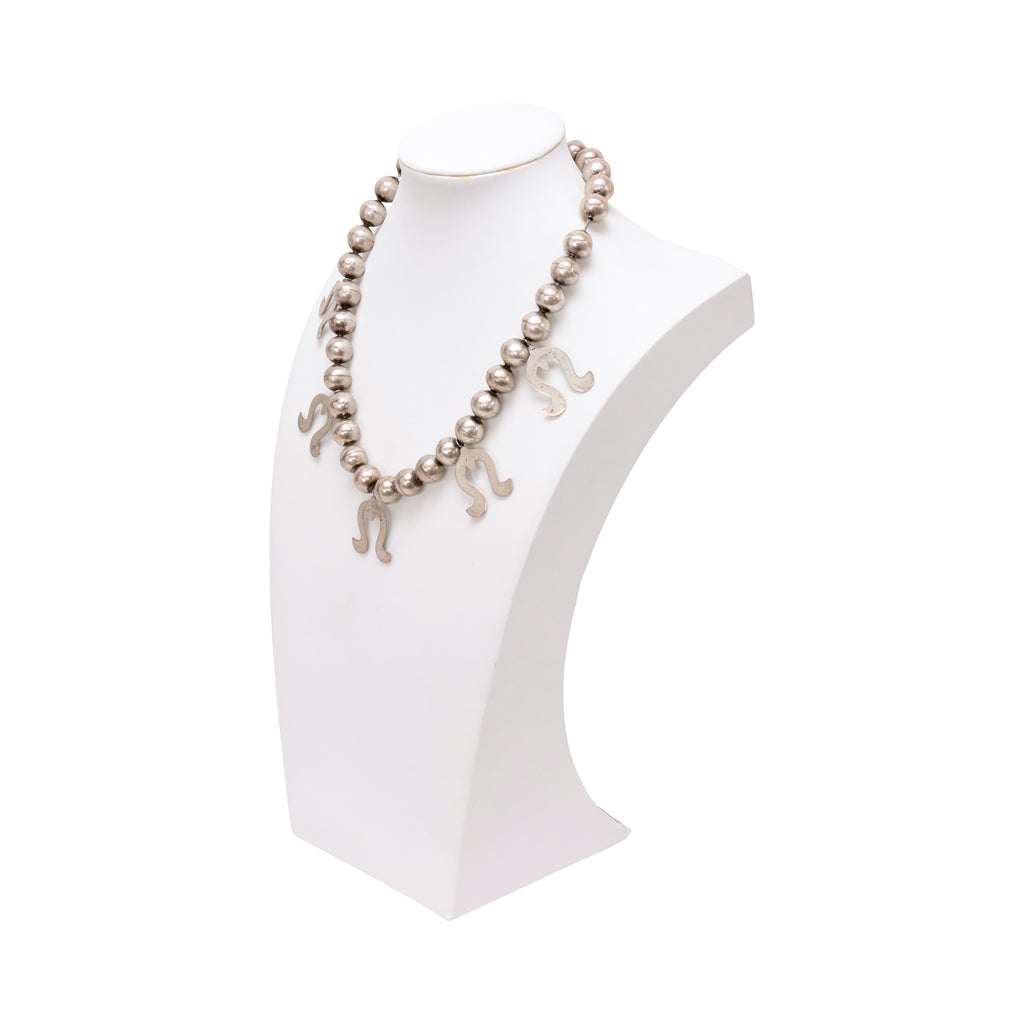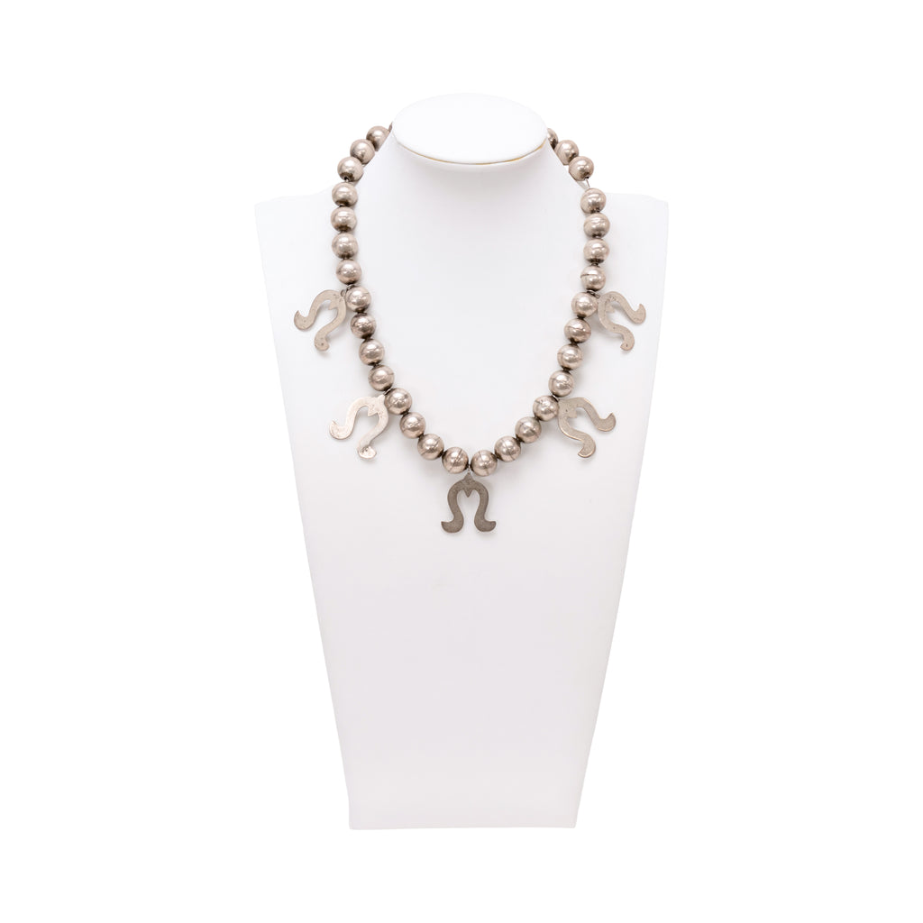 Sterling silver sand cast necklace. Handmade sterling beads with five fleur d'lis dangles. Nice patina, shows age. Unmarked. A desirable piece. 17"L