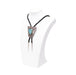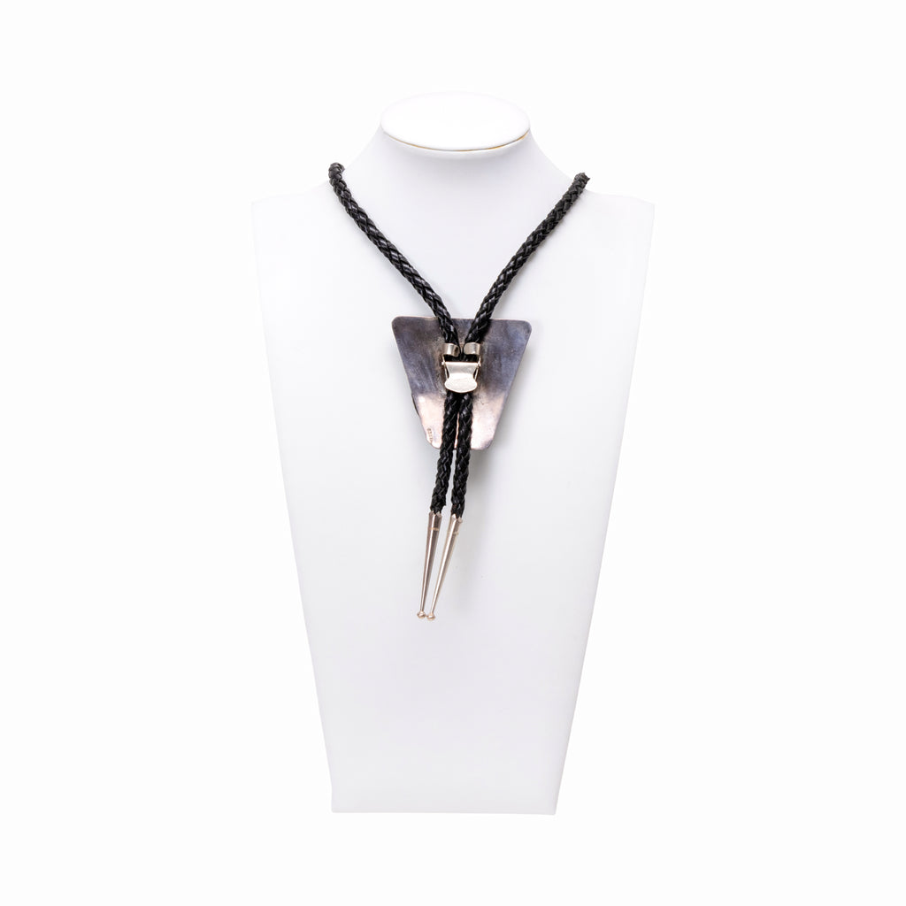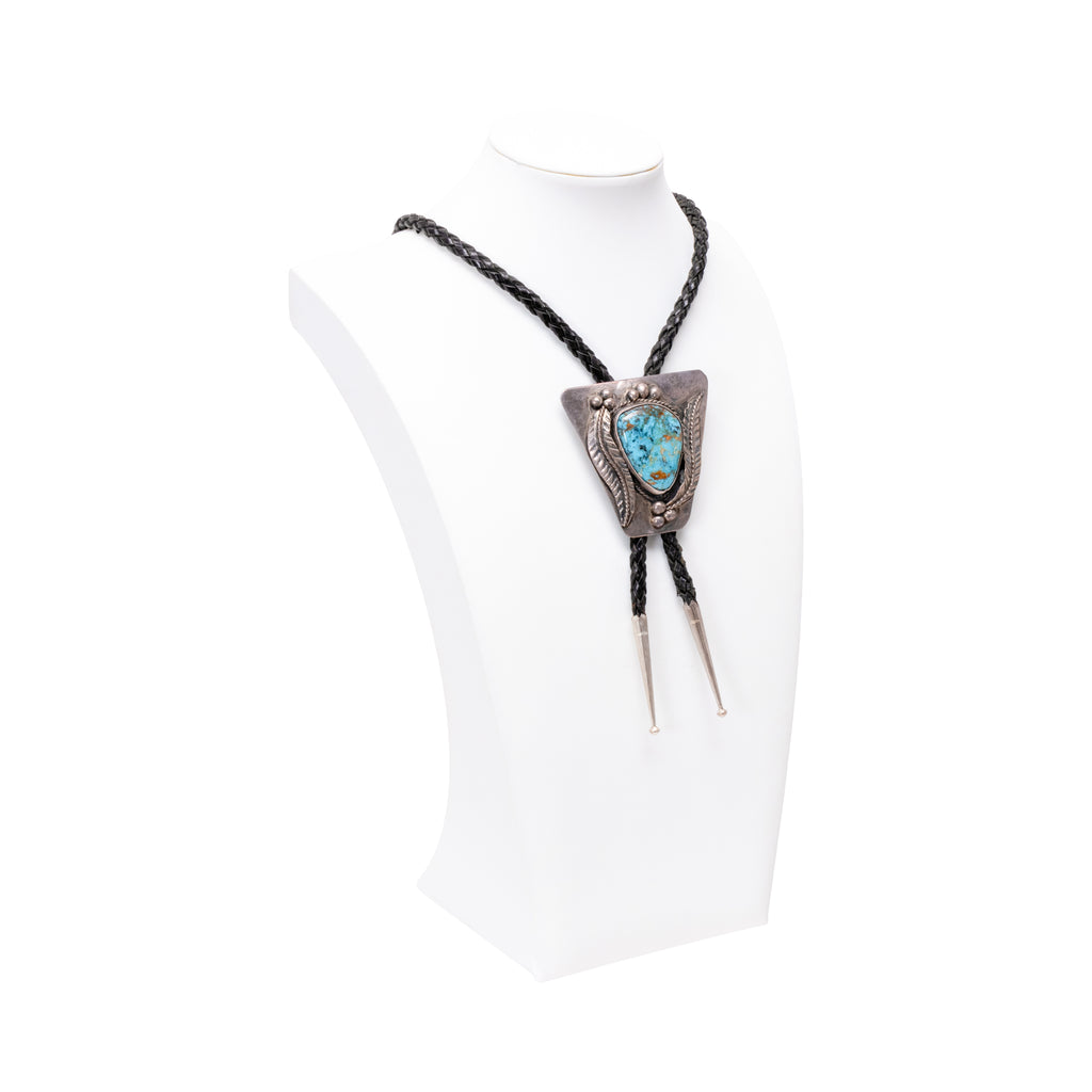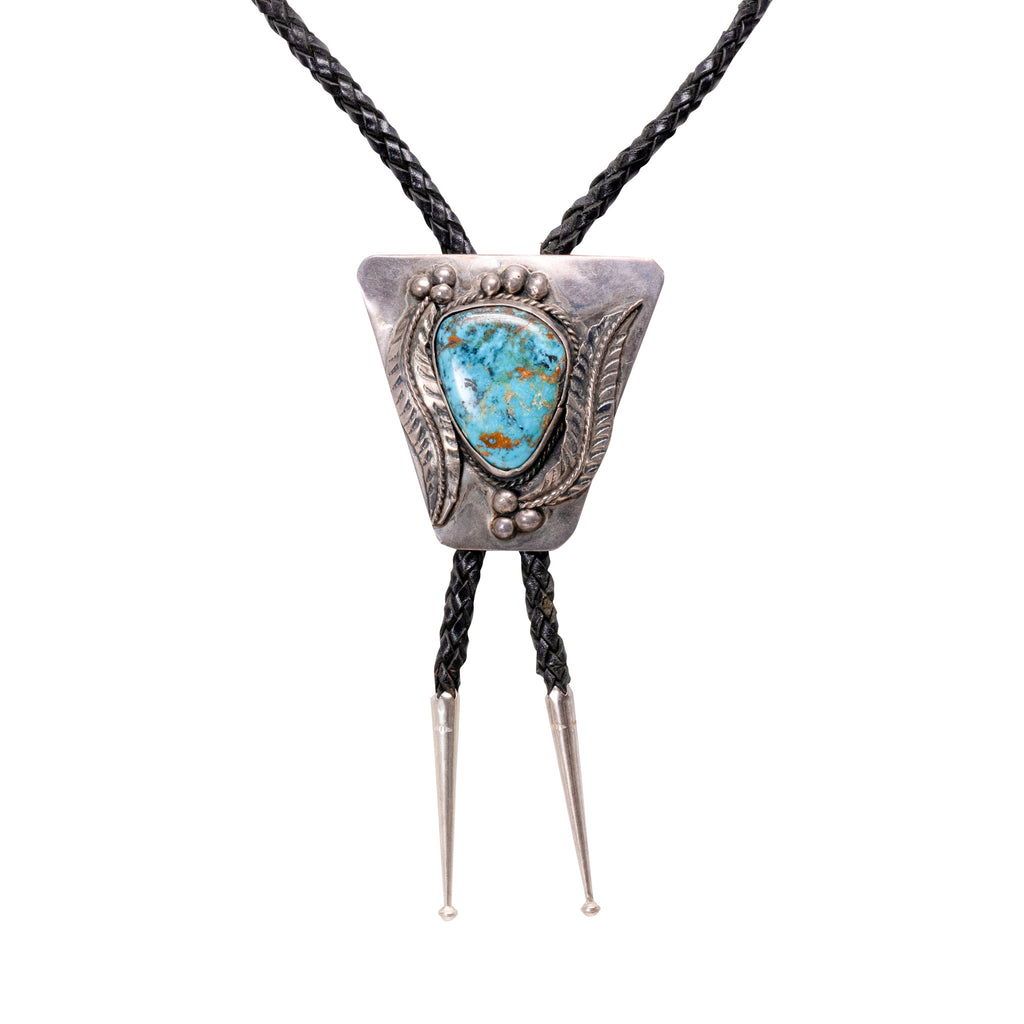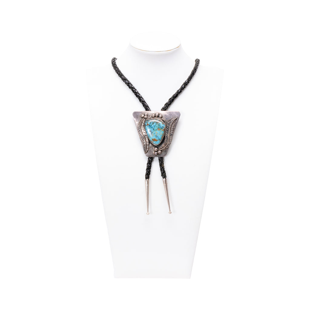 Sterling silver bolo with single turquoise stone. Set in thick sterling shield with silver leafing and beads. Marked "Mexico" on back.