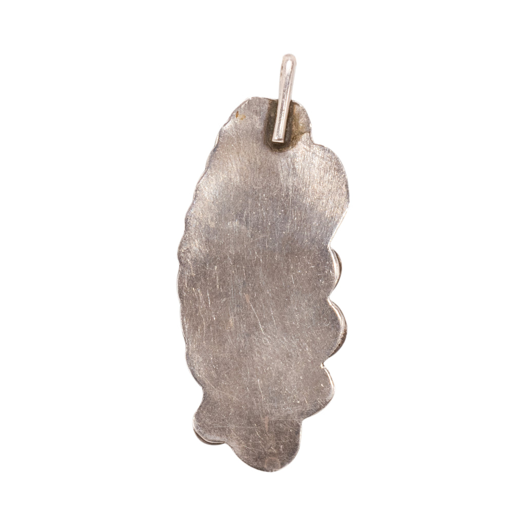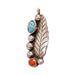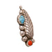 Native turquoise and coral sterling silver pendant. Natural, untreated Kingman turquoise stone with sterling beads and coral stone alongside elgonated sterling leaf. No maker's mark. 2'L