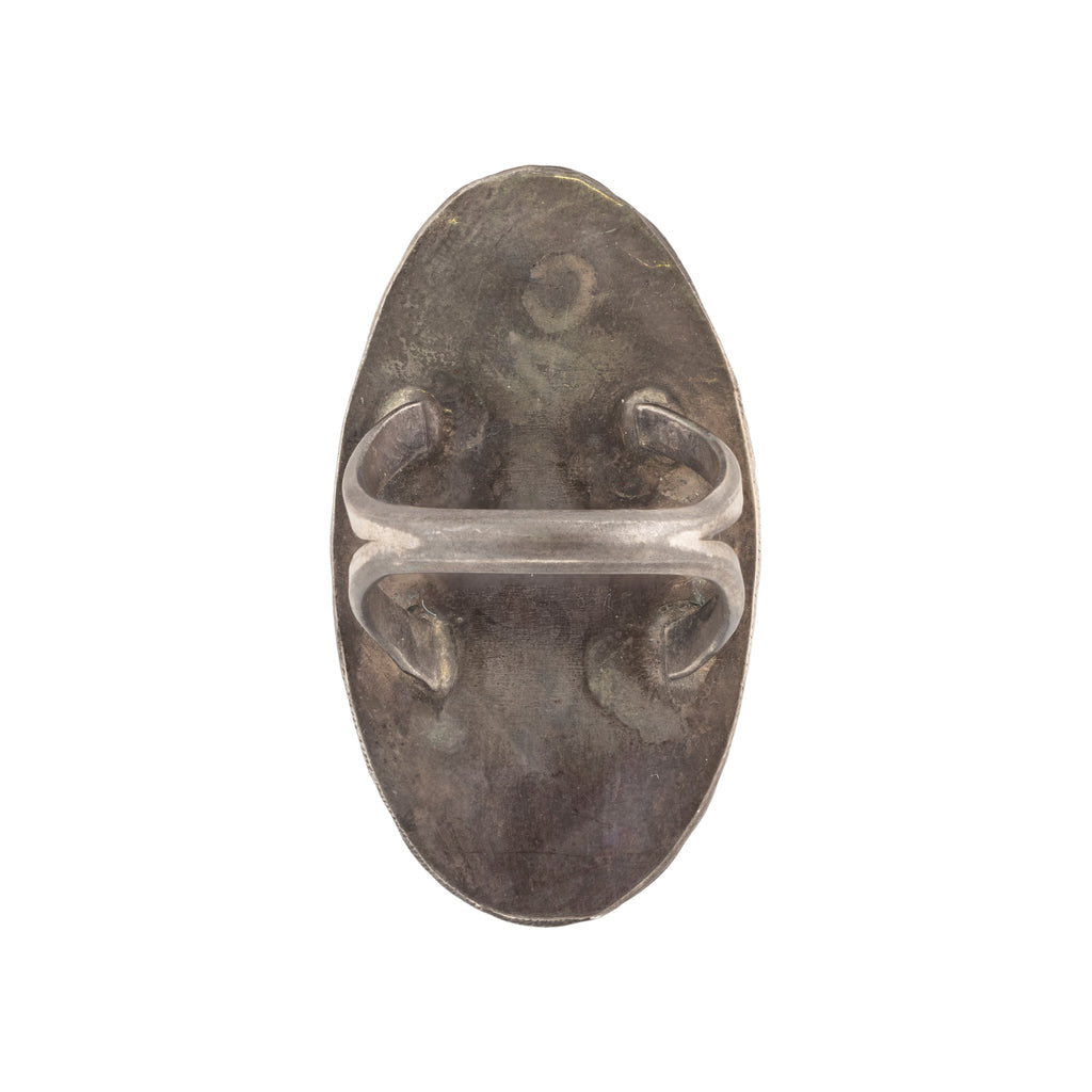 Sterling and turquoise ring with beautiful elongated center stone surrounded by twisted rope border. Stone is a lovely blue-green color with brown and gold matrix.