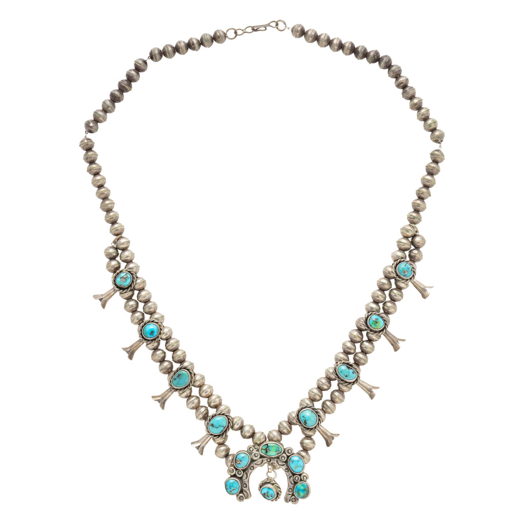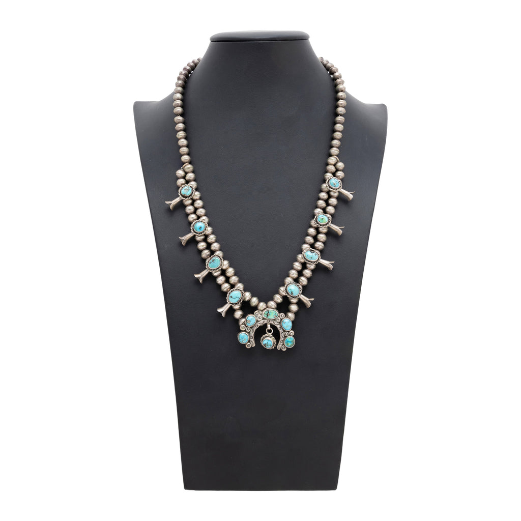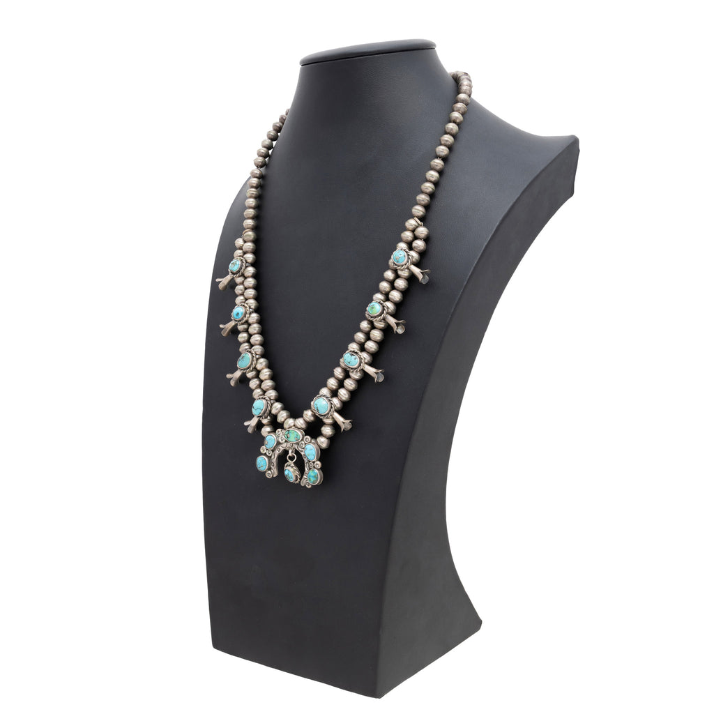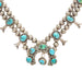 Navajo sterling silver and Kingman turquoise squash blossom. Eight petals turquoise beads and twisted rope border ending in matching naja with additional six stones. Strung on double sterling silver beaded chain. No maker's mark. Petit and lightweight. 24"L plus 1 1/2" naja
