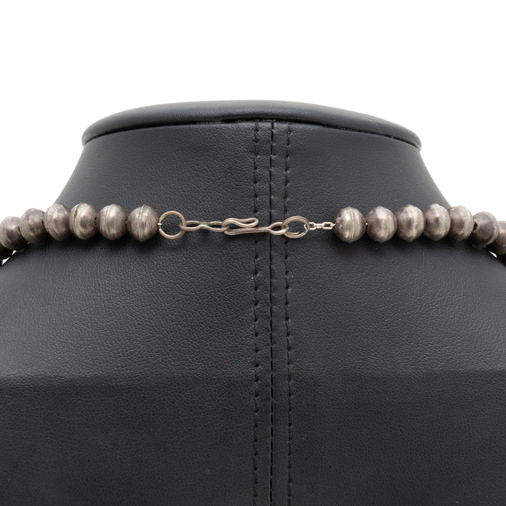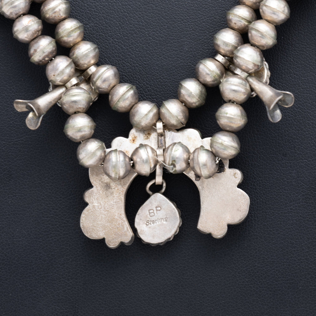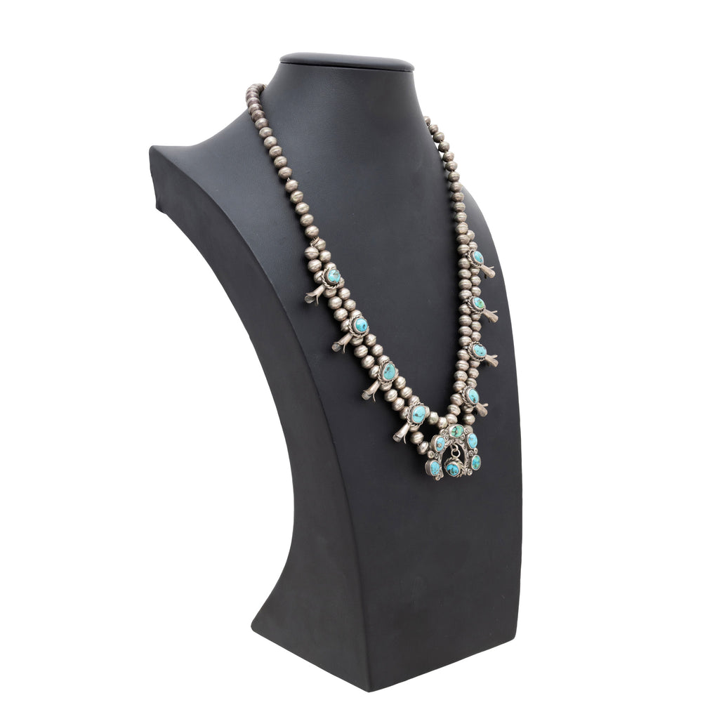 Navajo sterling silver and Kingman turquoise squash blossom. Eight petals turquoise beads and twisted rope border ending in matching naja with additional six stones. Strung on double sterling silver beaded chain. No maker's mark. Petit and lightweight. 24"L plus 1 1/2" naja