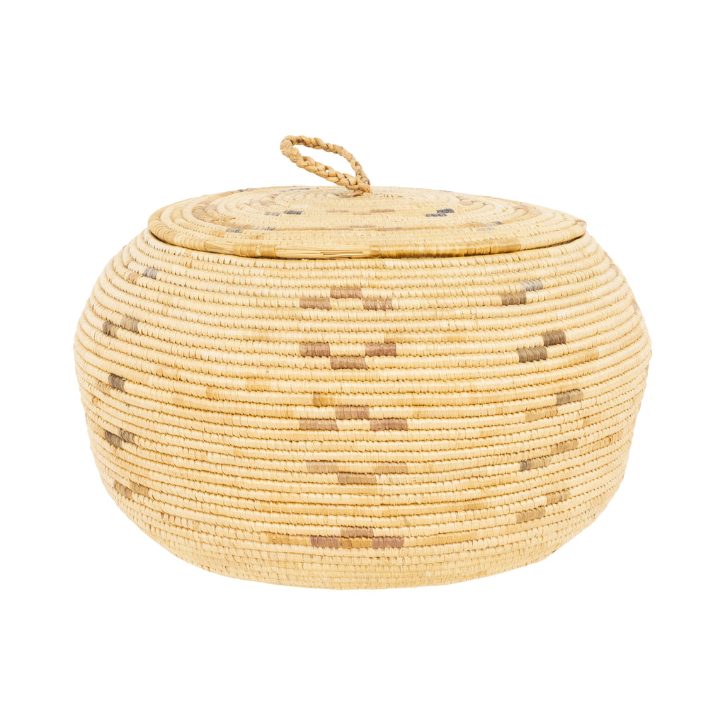 Alaskan lidded basket. Some missing imbricated on lid. Geometric designs on body and lid with braided loop handle. 6 1/2"D x 4 1/4"H