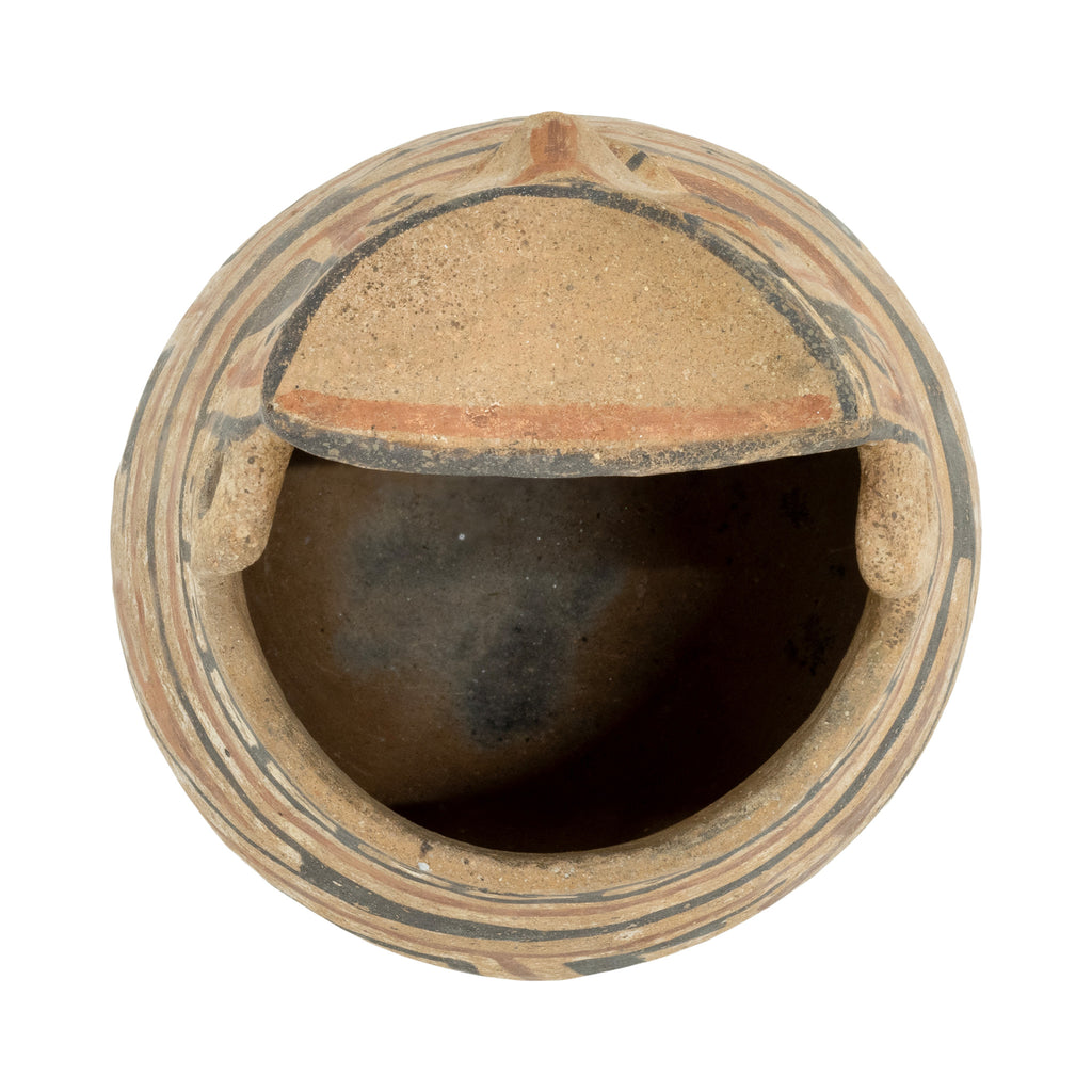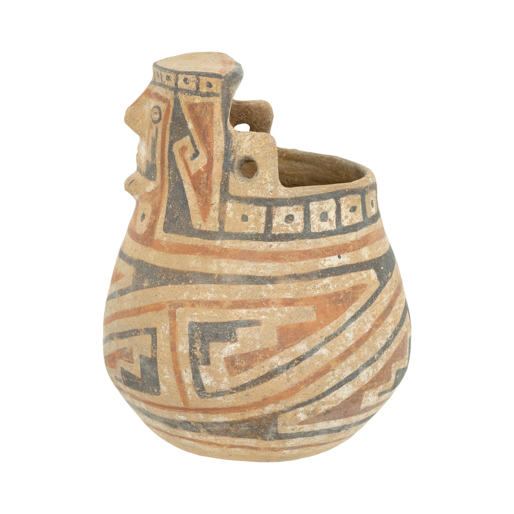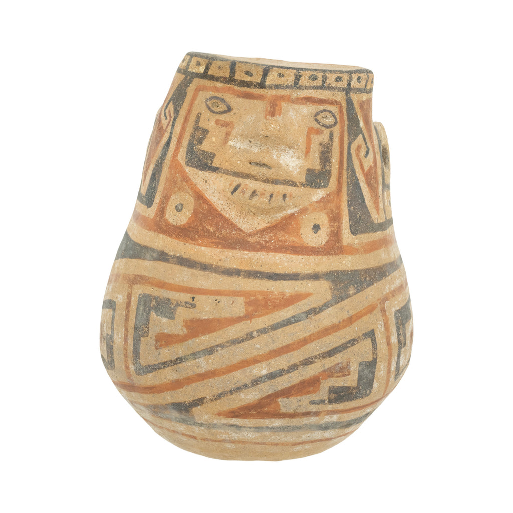 Casas Grandes, Ramos polychrome type, ca. 1100 to 1450 CE. A fascinating pottery jar in the form of a nude male figure seated with hands on knees flanking a protruding phallus as his owl-like visage projects forward. Slender arms depicted in relief exten dfrom the broad rim of the vessel, which is placed just behind the stylized, avianesque head comprised of arched brows, a widow's peak, wide eyees with elongated outer corners, a straight nose, and a petite. 4 1/2"D x 6"H