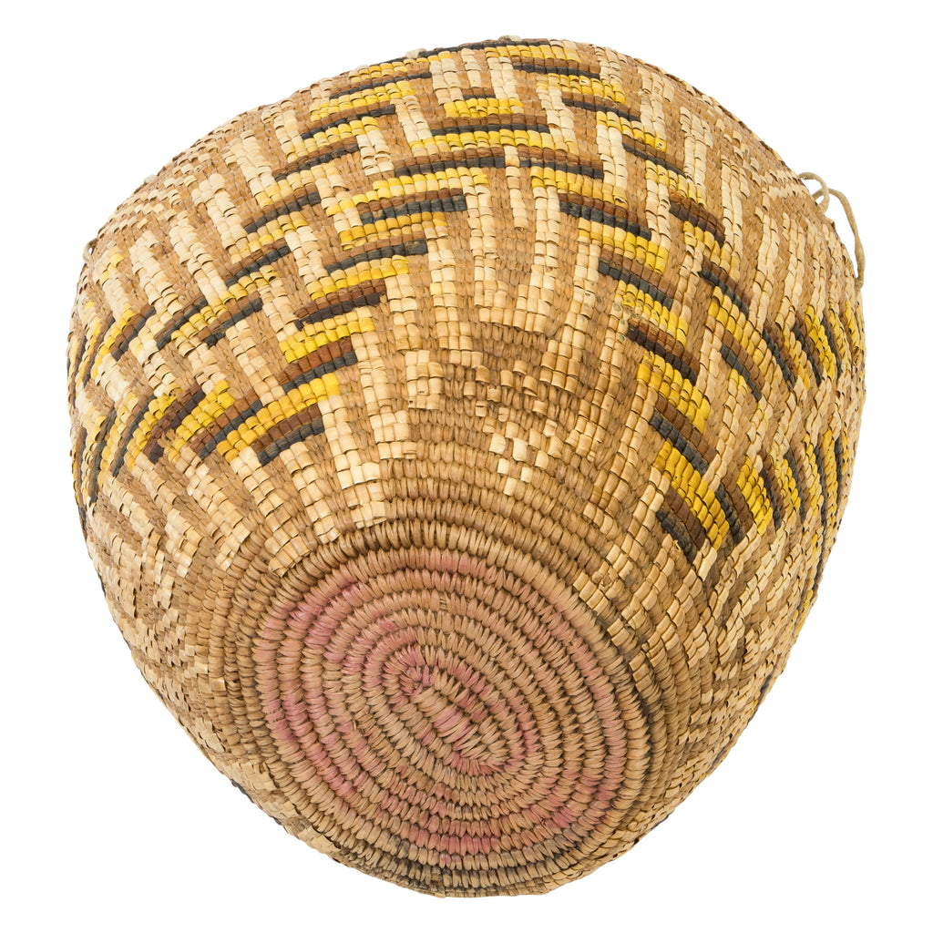 Cowlitz basket by Sophie Thomas Heck. Purchased from a decedent. He and siblings used small picking baskets to gather huckleberries and fill the larger basket. Grandmother loaded their pockets with candy so they would not eat the huckleberries. 12” x 12”.