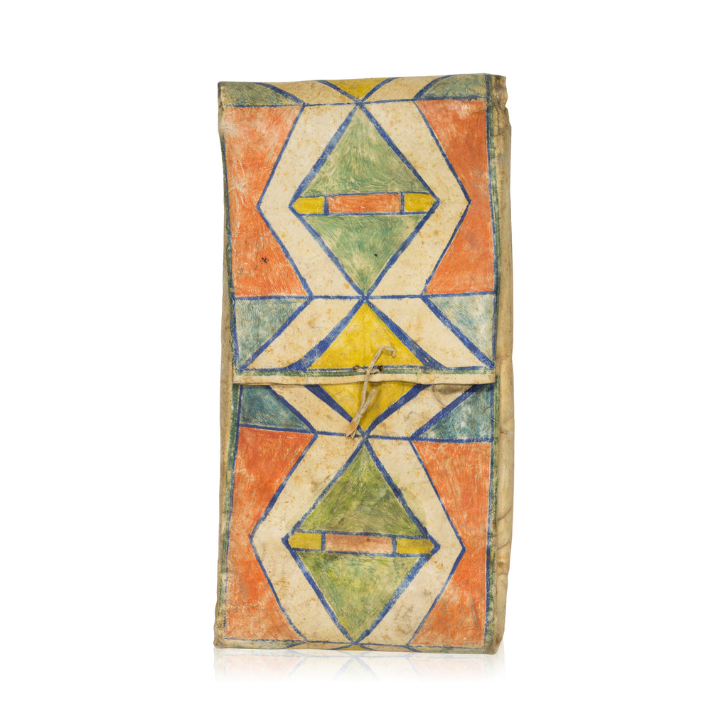 Finely painted. 25" x 13". The term parfleche was first coined by the French fur traders and derived from the French word “parer” meaning defend and “fleche” meaning arrows, as the hide was tough enough to be used as a shield and deflect an arrow. The original containers had graphics that were maps, geographical depictions such as rivers and mountains, or symbols that told the family’s stories. Once the parfleche left the family, the story was lost and the parfleche became Native American art rather than a meaningful storyteller.