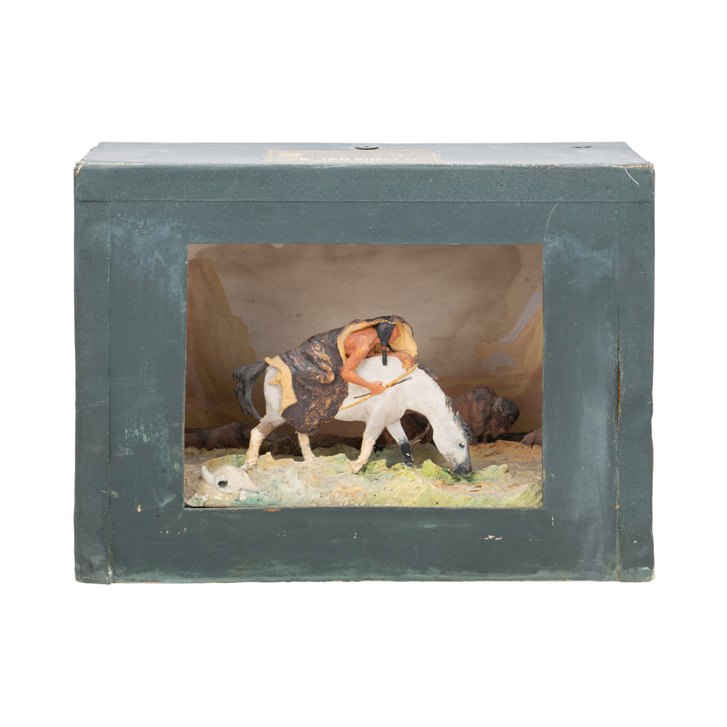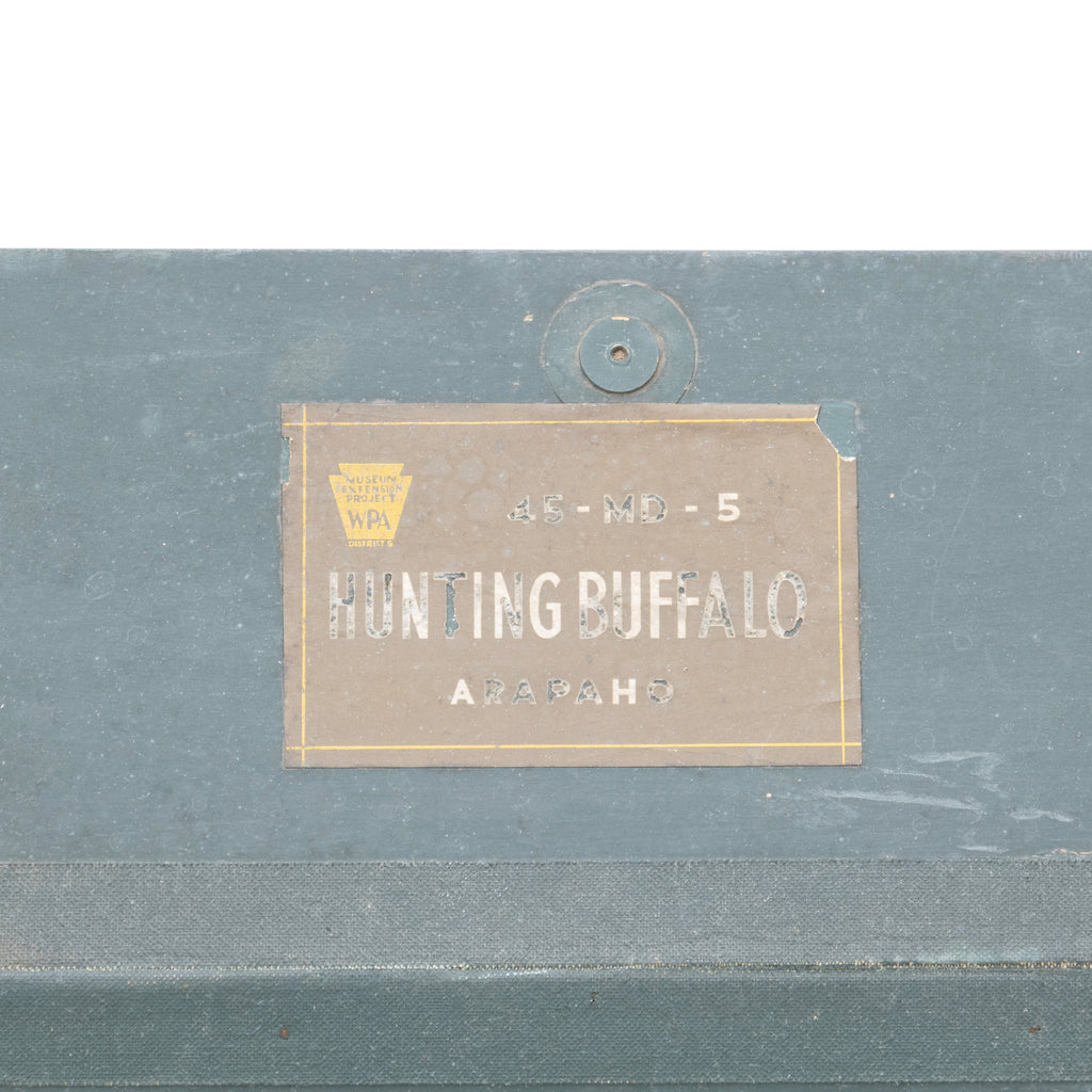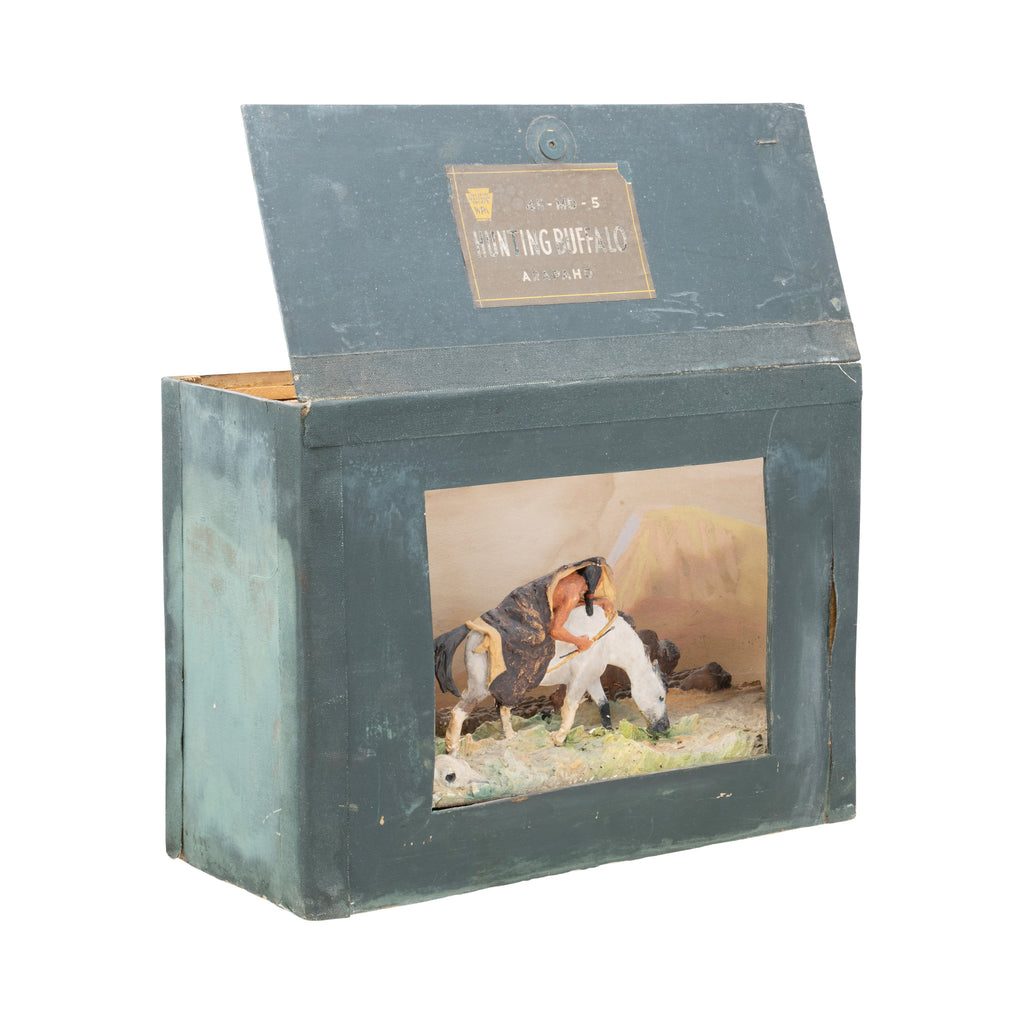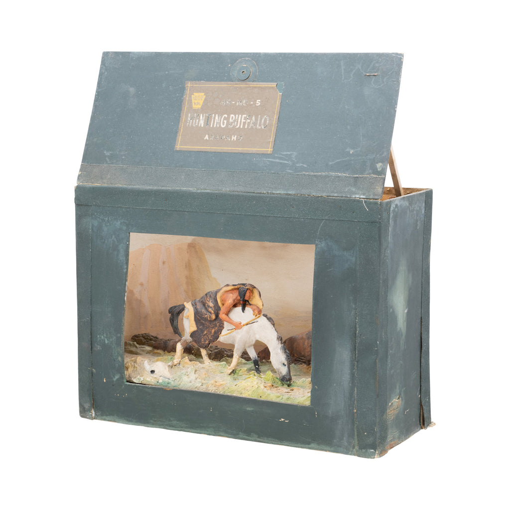 "Hunting Buffalo - Apache" vignette. WPA Philla (Philadelphia) Unit Statewide Museum Extension Project. Scene of a warrior on horse covered with buffalo robe with bow stalking buffalo. 15 1/2" x 6 1/2" x 11 11/2"