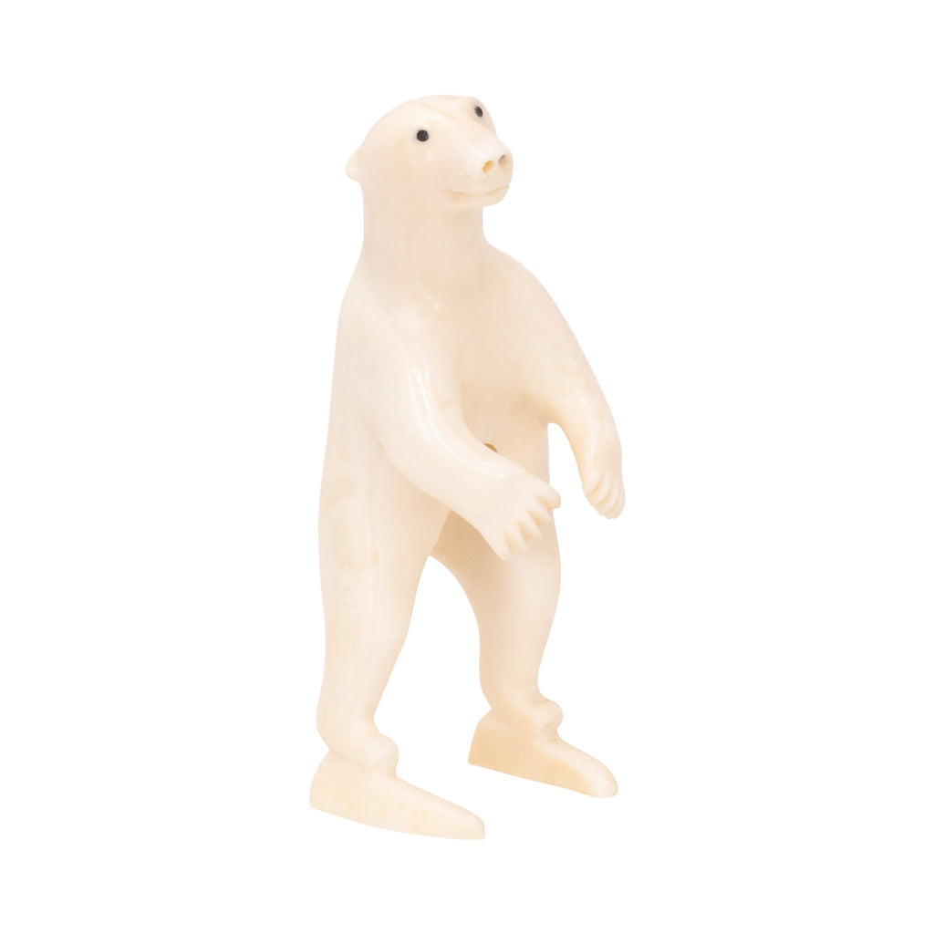Inuit carved polar bear on ice skates. Unmarked. Smooth fossilzied walrus ivory bear with baleen embellishments. These carvings were usually small carvings from walrus ivory, representing local animals and Inuit themselves, going about everyday life. Seals, caribou, polar bears, birds, and other animals important to Inuit’s survival were often represented. 4 1/2"H