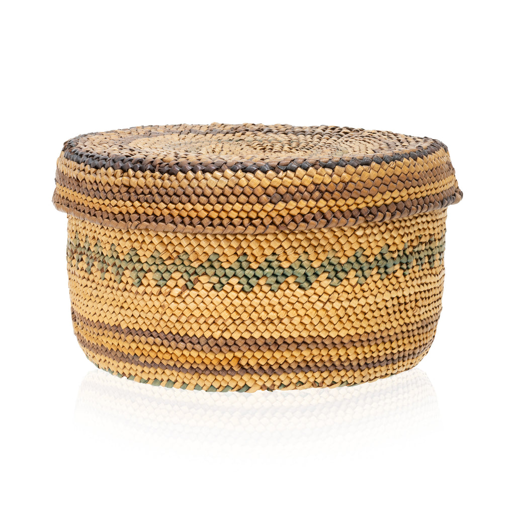 Makah lidded basket. In the 1860s the Makah people at Neah Bay developed a cottage industry producing trinket baskets. These were very labor intensive, fully twined baskets of twisted cedar bark. Through the 1930s they wove thousands of the small colorful trinket baskets for sale. 1898-1920. 2"H x 3'W