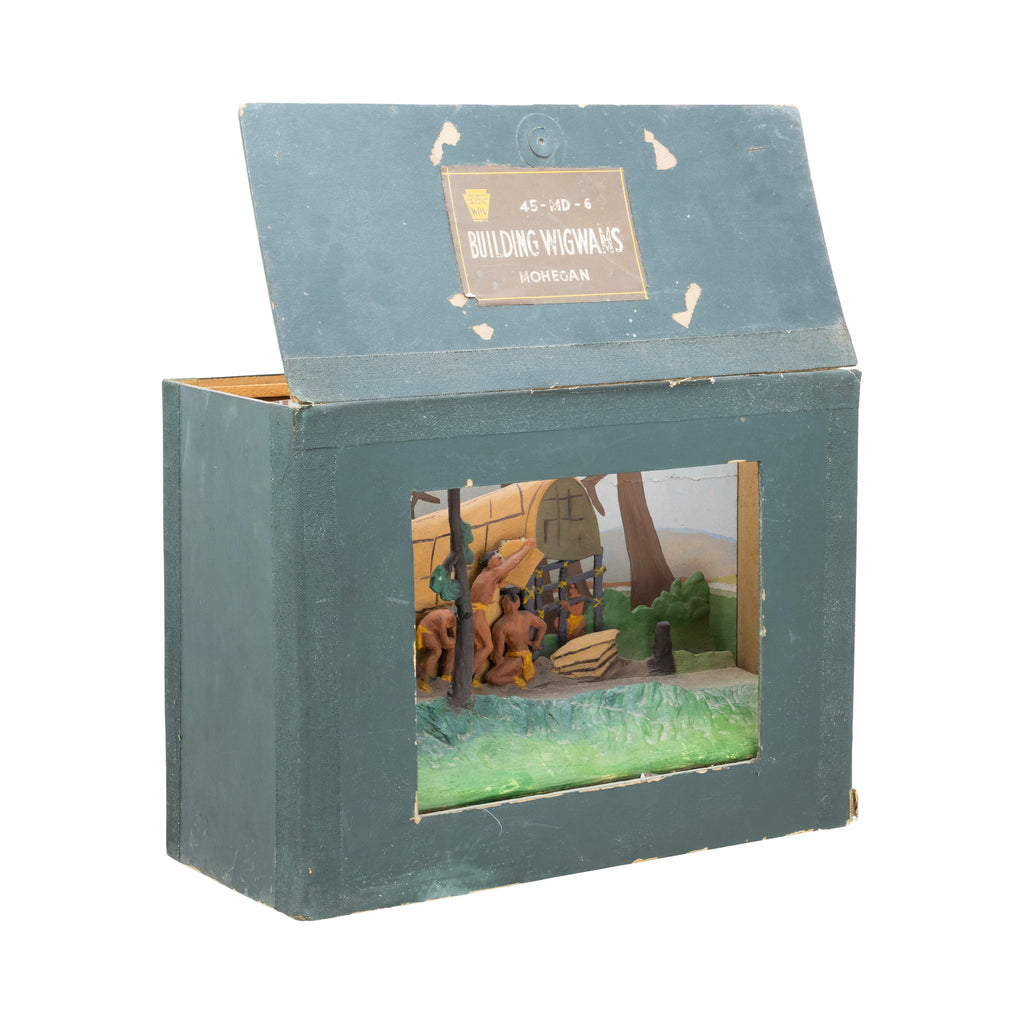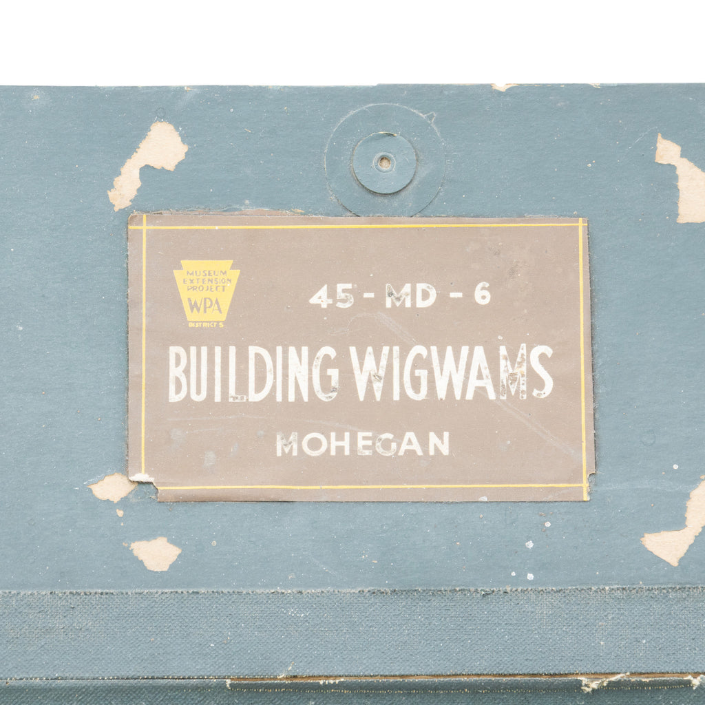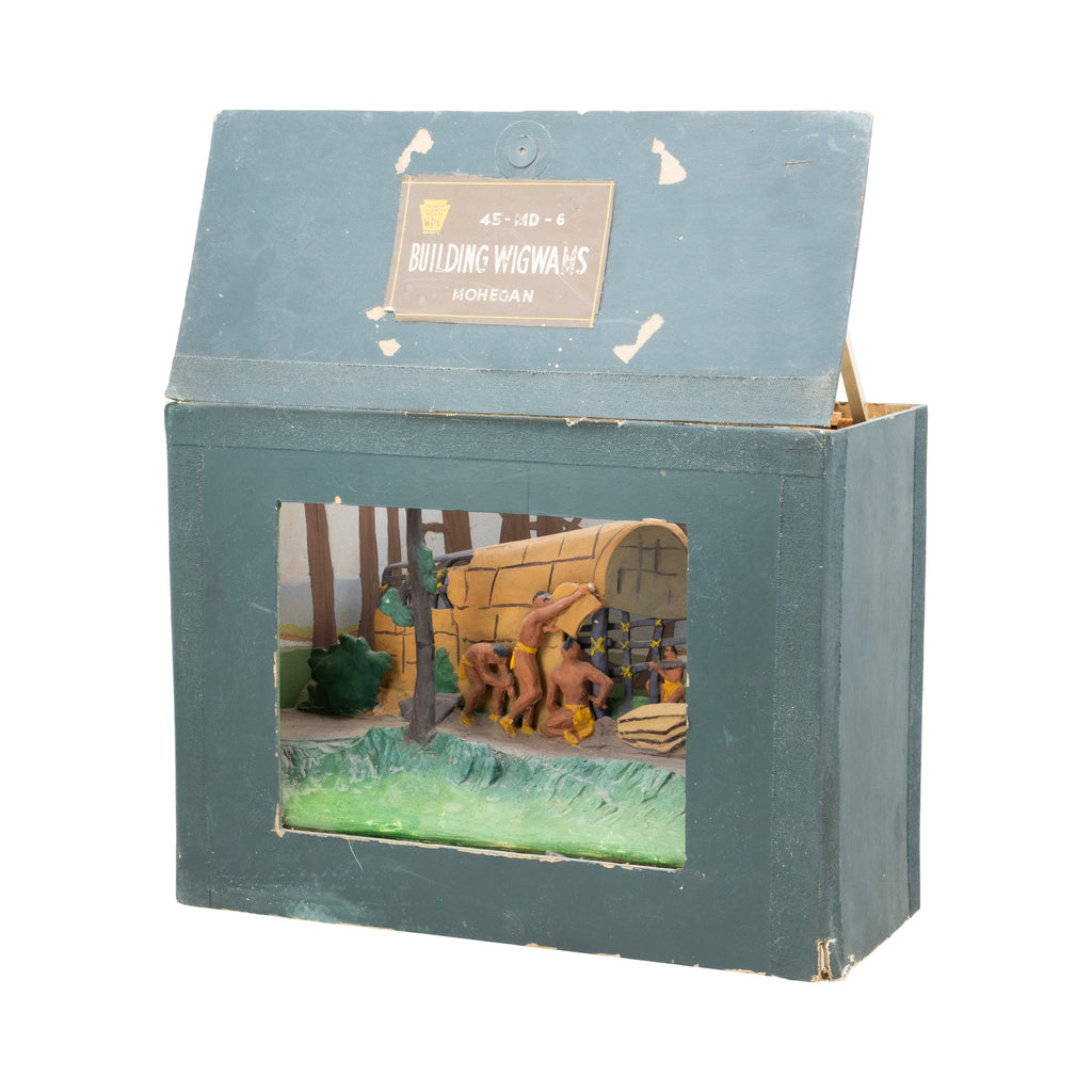 "Mohican Building Wigwams" WPA vignette. Phila (Philadelphia) Unit Statewide Museum Extension Project. Scene of four Native Americans applying bark to hogan/wigwam. 15 1/2" x 6 1/2" x 11 11/2"