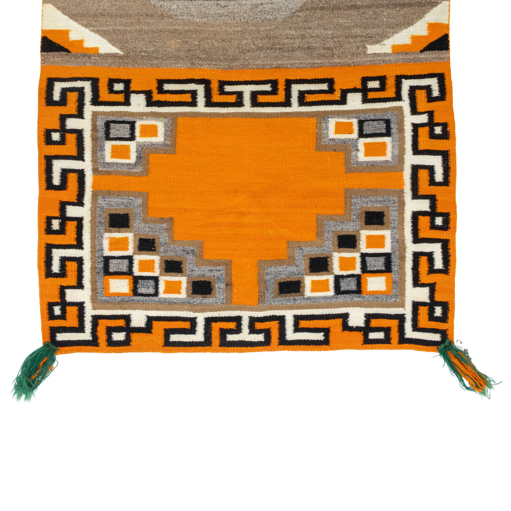 Navajo double saddle blanket. Two distinctly different patterns, one banded and naturals, and the other gometric crystal with fishhooks. Both sides with similar blocked borders. A collector piece. 50" x 36"