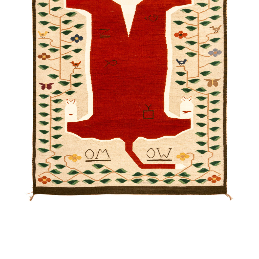 Navajo steer pictorial weaving. Exceptionally fine and tight weaving. Hereford steer surrounded by vine and leaf border having birds, butterflies and flowers. Intials OM and OW at base - assume a commissioned weaving. Ex. Cameron Collection