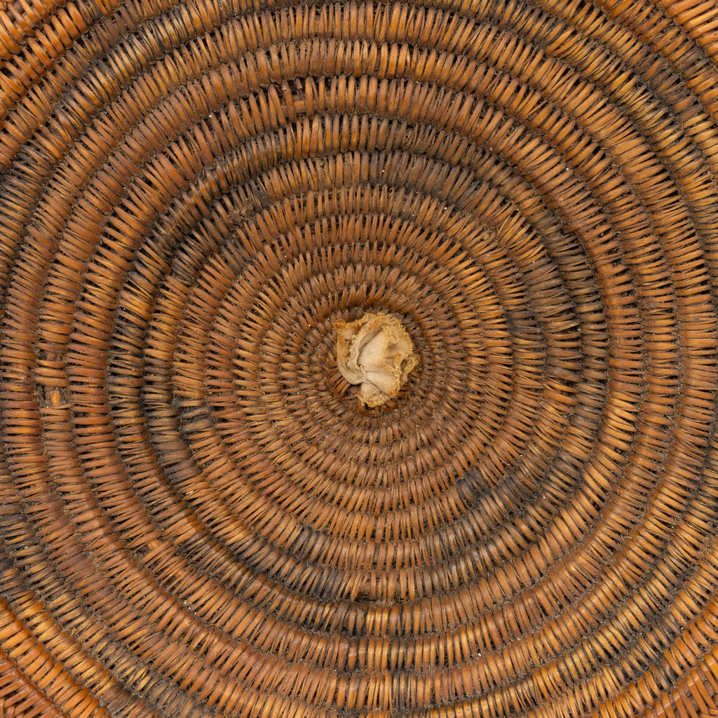 Navajo wedding basket. A used piece. Cloth center. May have been oiled for dark golden patina. 19th Century. 14" x 2 1/2"