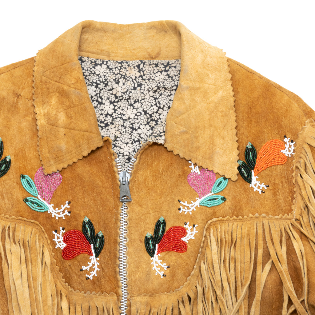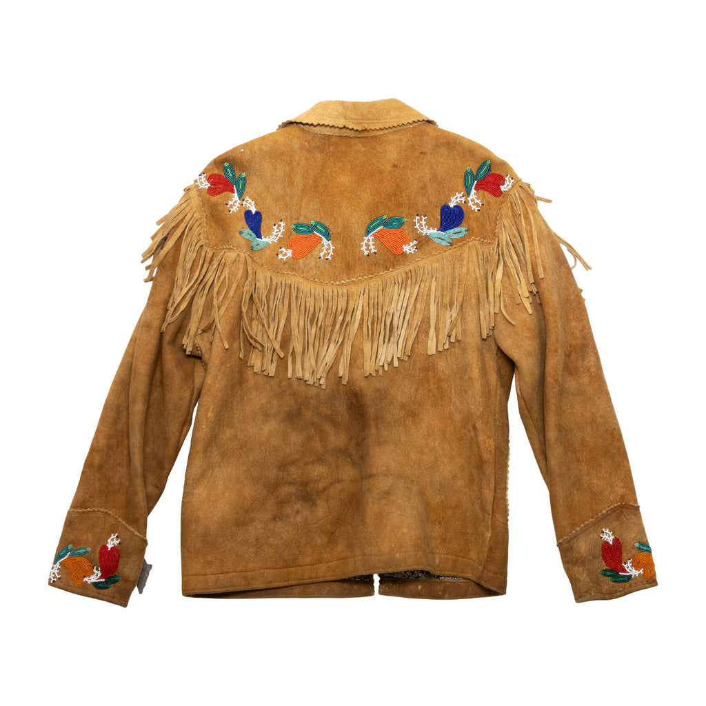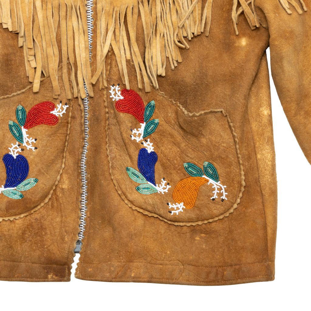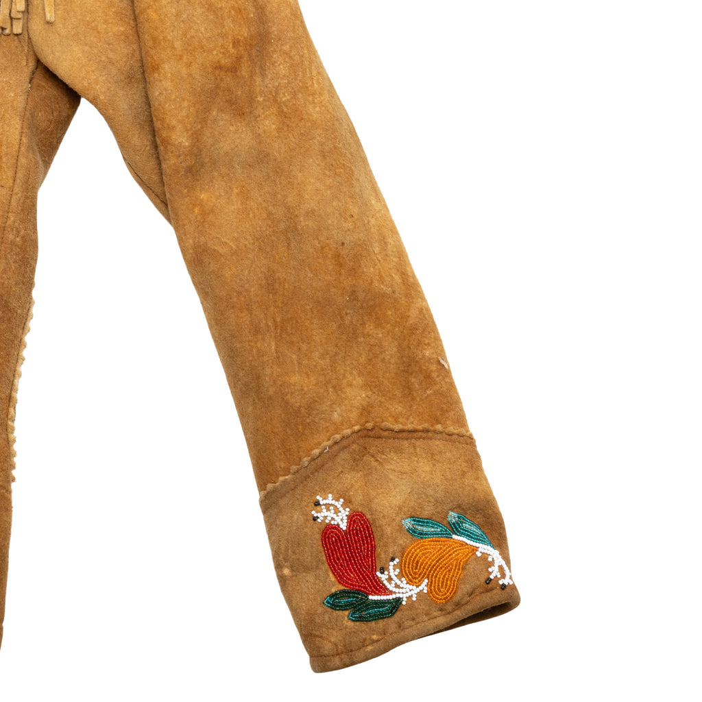 Northern Cree scout jacket of smoke tanned moose hide, fringe and stylized floral design. Front pockets and back. Flour sack lined. Mid 20th Century. A wearable jacket. Just the right look. Approximate size 44.