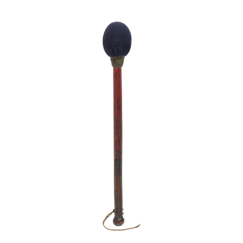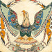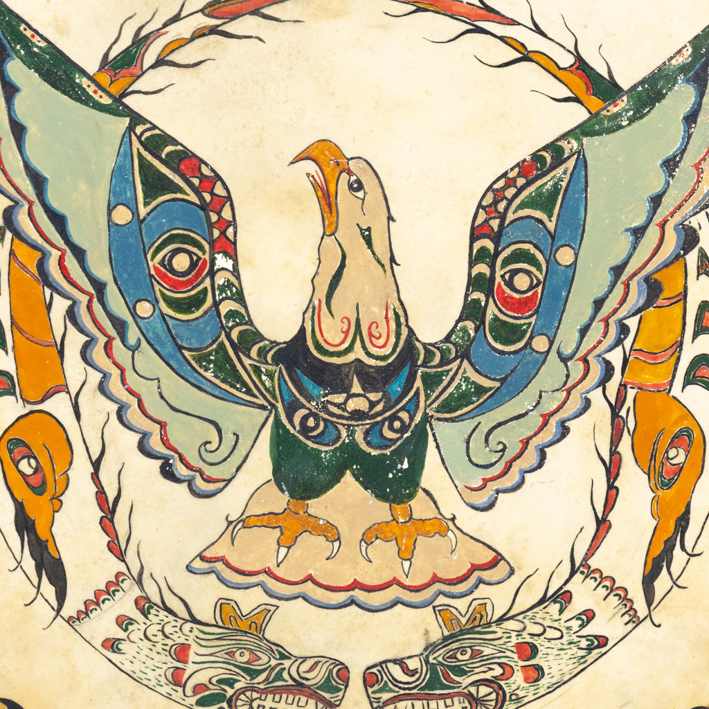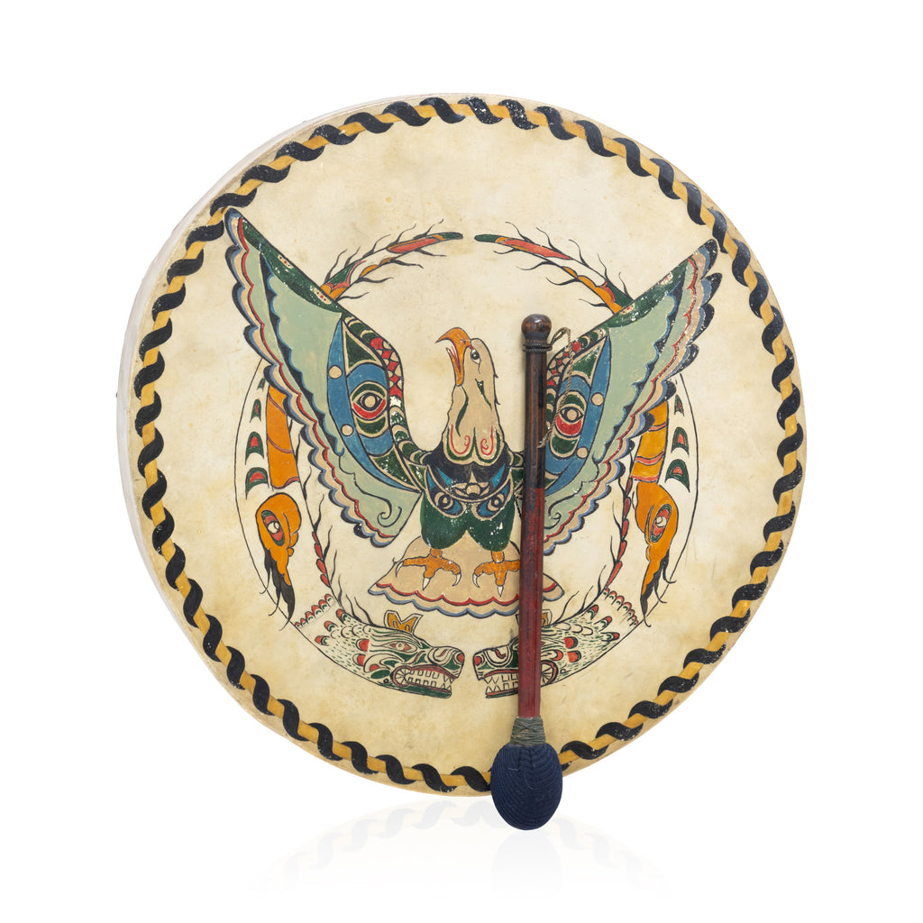 Northwest coast Kwakiutl painted pictorial drum. Stretched hide on a bent cedar frame, painted with eagle wings outstretched framed between a pair of sea serpents within a twining surround, inscribed on the frame interior "Ed Clulesi/Alberni BC." Comes with drum beater. 17 1/2"D x 2 1/2"