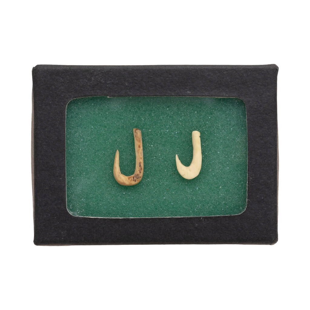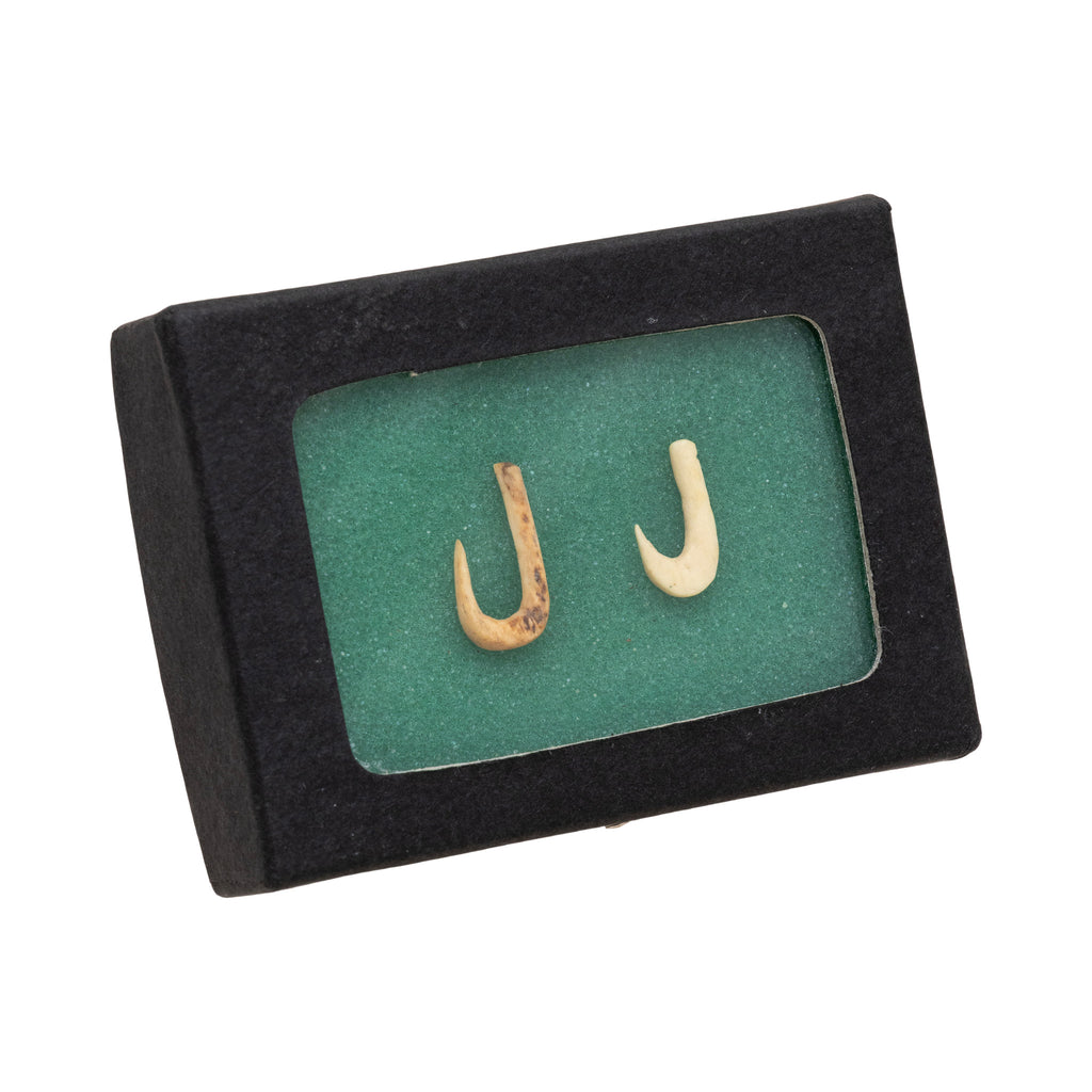 Two prehistoric Native bone fishhooks. Both appear to have been used. Largest 5/8"