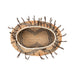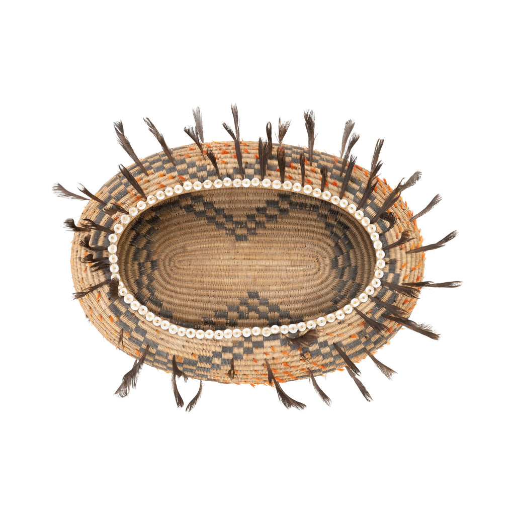 Early Pomo feathered basket. Circa 1890. Three rod warp (Sitka Willow), sage root, black blackened fern root, white clam shell rim, quail top knots and flicker feathers. Oval shaped. 9 1/2" x 7" x 3". Under the name Pomo are some 30 small tribes. The tribes which made these baskets live in Lake Sonoma and Mendocino counties, and are examples of their best work. The materials used are California sedge, nut pine, black rooted sedge, Sitka willow, Douglass spruce beaked hazel, California flax, red fir, poison oak, bracken, bullrush, nutmeg, Oregon grape, syringa, maiden-hair fern, digger pine, green briar, willow, redbud, bracken, calycanthus and hazelnut. Beautiful feathered night basket. The design, or legend on this basket represents “night.” The dark feathers represent night, the outer rim of wampum and beads present the moon. The pendants of abalone shells represent the stars. These baskets are used as wedding gifts and are greatly treasured by the tribe. The time required to construct one of these baskets is two years.