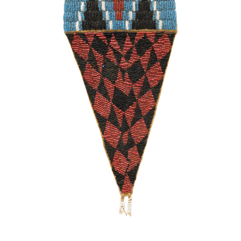 Ute beaded tail bag, Ute in form and style however influenced by the allied Jicarilla Apaches. A picture of Chipeta taken in 1870 shows an exceptionally similar bag. Chipeta herself, a Kiowa/Apache married Chief Ouray who was an Ute/Apache. This very classic bag has the unusual color palette favored by Ute's in the latter part of the 19th Century. 19"
