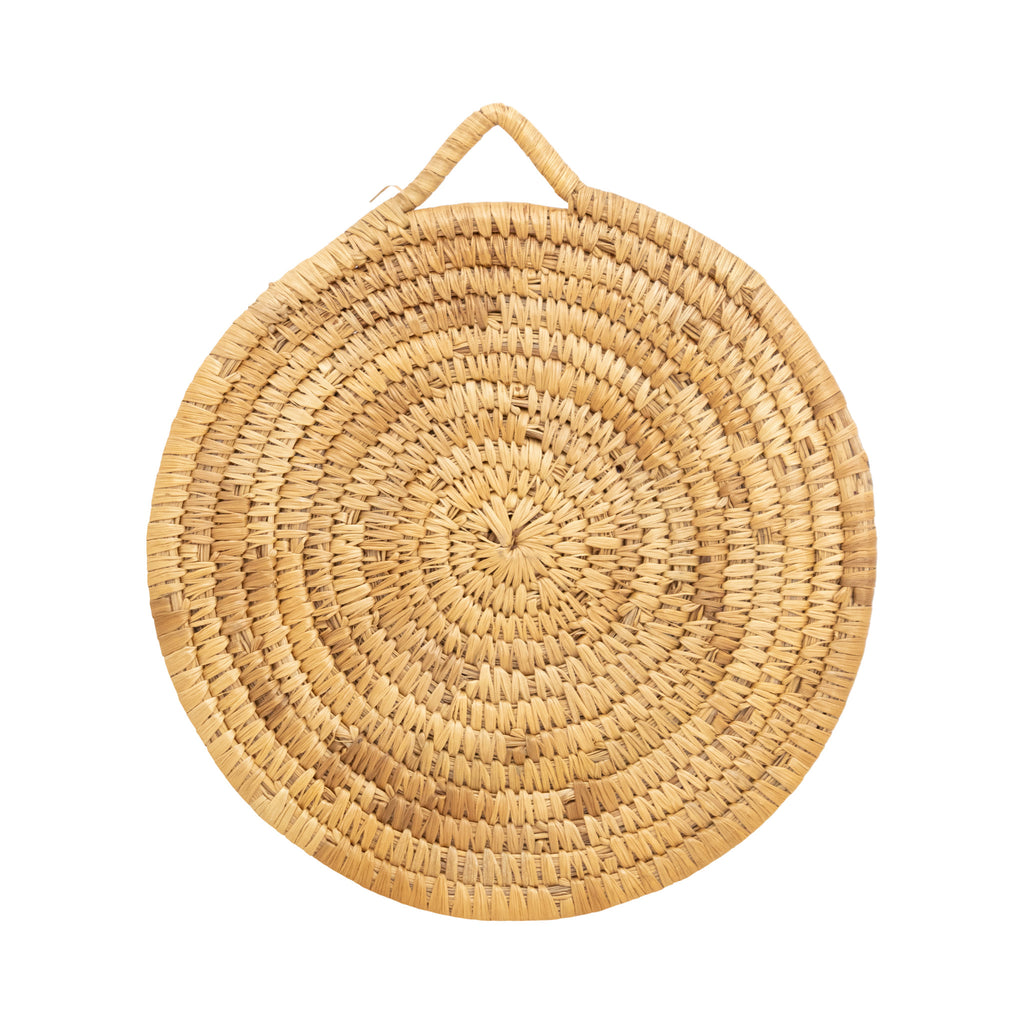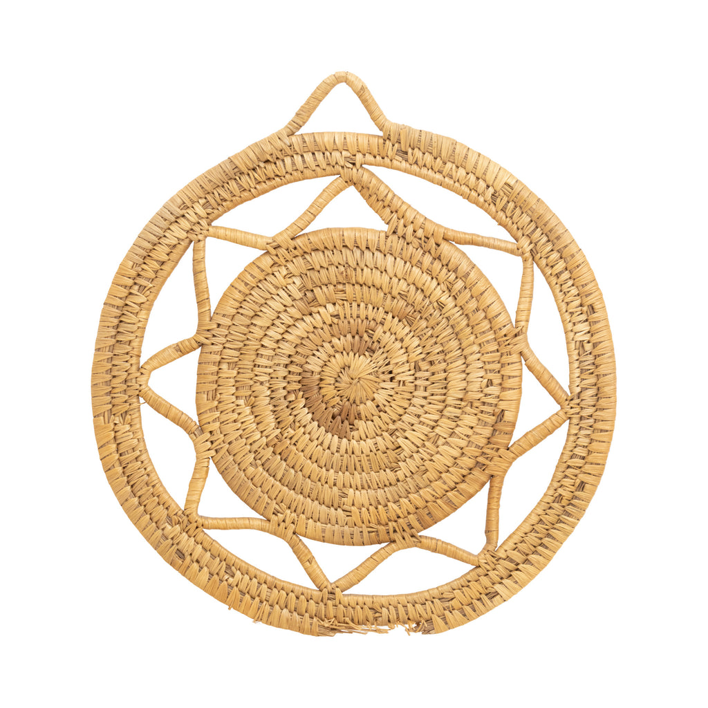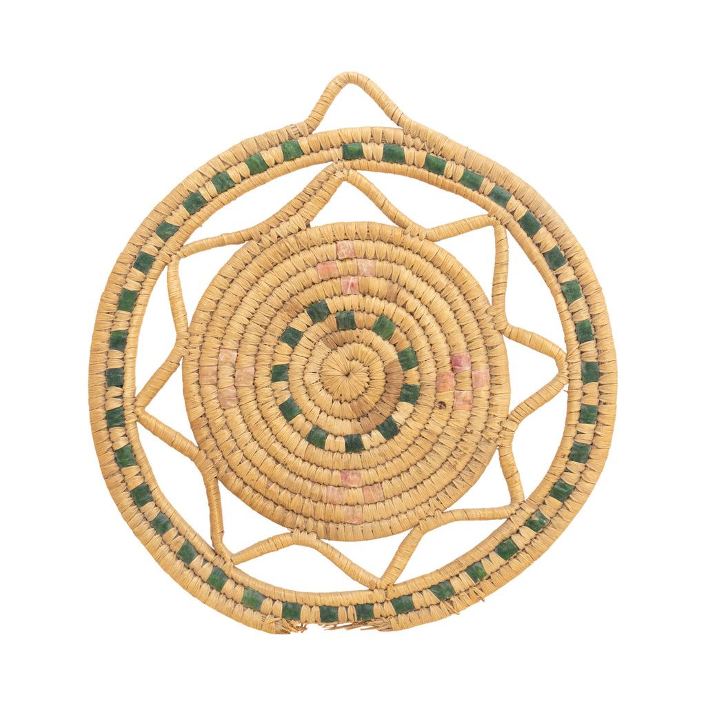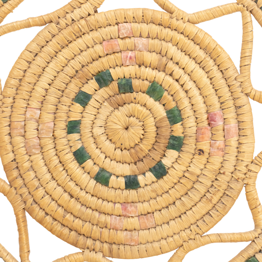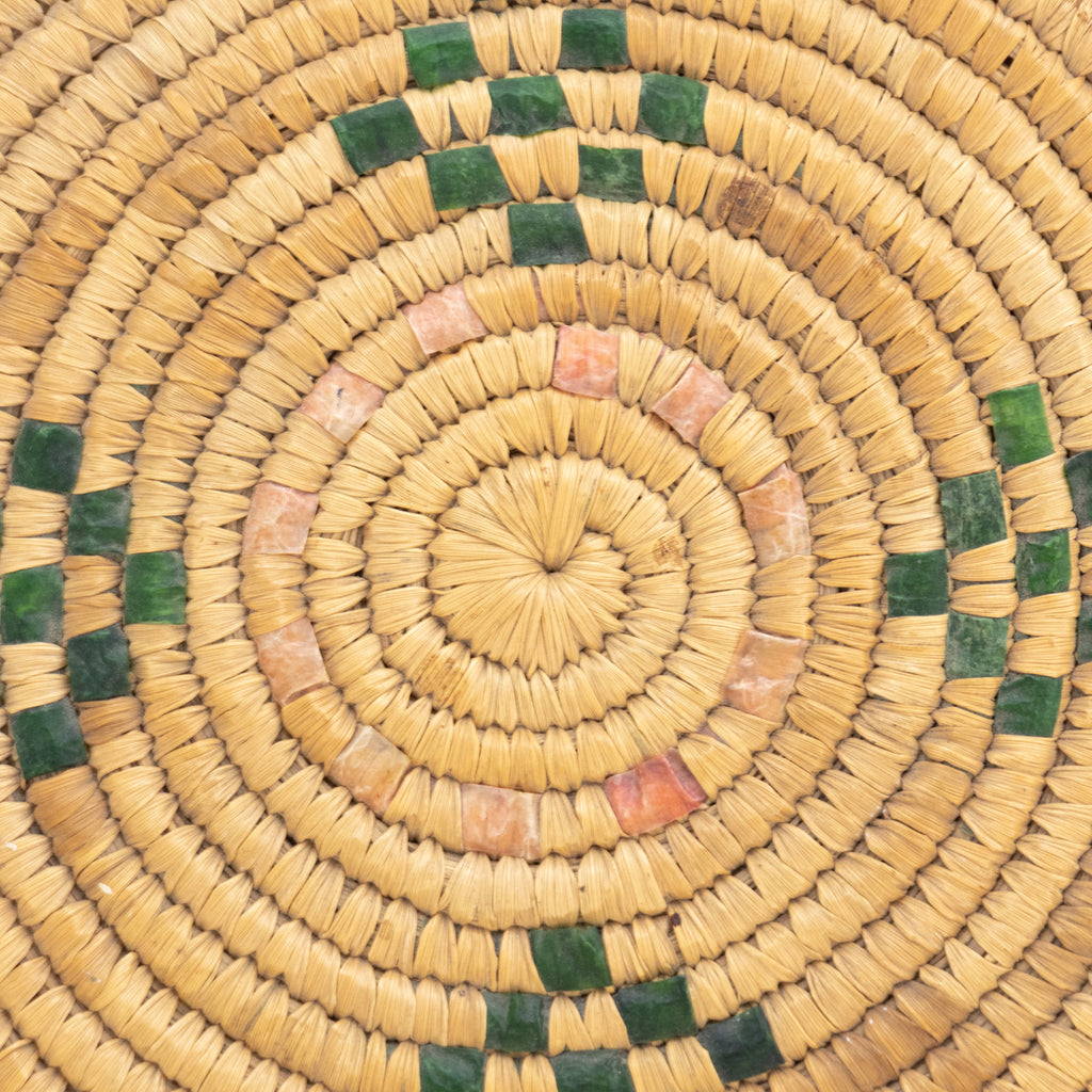 Alaska Eskimo coasters decorated with green and red seal gut. Circa 1940. 7" and 4"