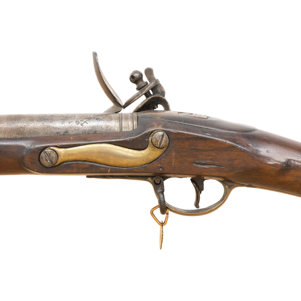 British India Pattern Brown Bess Smoothbore Musket British India Pattern Brown Bess musket 39” barrel, 55” overall length, .75” bore. The musket features walnut stock, steel barrel and steel lock plate, hammer and frizzen pan. The trigger guard, butt plate, end cap and ramrod tubes are made from brass. The lock is engraved with the word Tower as well as a Crown over the letters GR. The barrel is marked with various proof marks including a V over two crossed scepters. The upper tang is marked with a crown symbol above the number 2. The butt plate is stamped with the number 8. The stock has various stamps including the letters G, V, and the number 80 stamped on the left-hand side near the rear lock screw. The number 85 is stamped on the right-hand side of the stock near the butt plate. There are two separate “crown over V” symbols on the bottom near the lower tang. The musket is in okay condition overall. The flintlock mechanism appears to be mechanically functioning. The stock has numerous nicks, dings and chips. There is one major crack in the forestock due to the woods grain that has been stabilized. Some of the pins holding the barrel to the stock have been replaced. The upper sling swivel is missing and has been replaced with a piece of steel rod. The ramrod appears to be period but has been sanded down on one end to fit into the stock easier. The brass ramrod tube near the barrel end of the musket has two gashes in it. The barrel features pitting and patina consistent with age. The bore appears to be in good condition but has not been inspected with a bore scope. Manufactured 1790-1850.