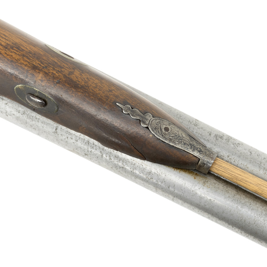 English double barrel percussion fowler shotgun. Gauge unknown. Two – 32.5” barrels. Barrel is marked on the underside with post 1813 Birmingham Proof Company proof marks and view marks (crossed scepters and crown mark, incorporating the letters BPC, together with the crossed scepters over a V. There are also the letters DL, and I stamped between the barrels. No manufacturer has been identified. The walnut stock features checkering at the grip. The barrels, lock plates, trigger guard, and butt plate are all steel. Much of the hardware is engraved with floral designs and other decorative motifs. Includes a ramrod (possible replacement.) Manufactured 1830-1855. Condition The shotgun is mechanically functional. Both hammers cock and hold. Cosmetically, the shotgun is in fair condition. Much of the hardware has been heavily buffed of period pitting and corrosion. The trigger guard appears to be a modern handmade reproduction. The bore has not been visually inspected (requires a borescope.) The stock shows signs of period wear (nicks, dents, scratches. There a multiple period breaks, chips, and cracks throughout the forestock and grip. All appear stable. Enhancements The only enhancement done to this antique fowler was the heavy buffing of the hardware and barrels as well as the replacement trigger guard.