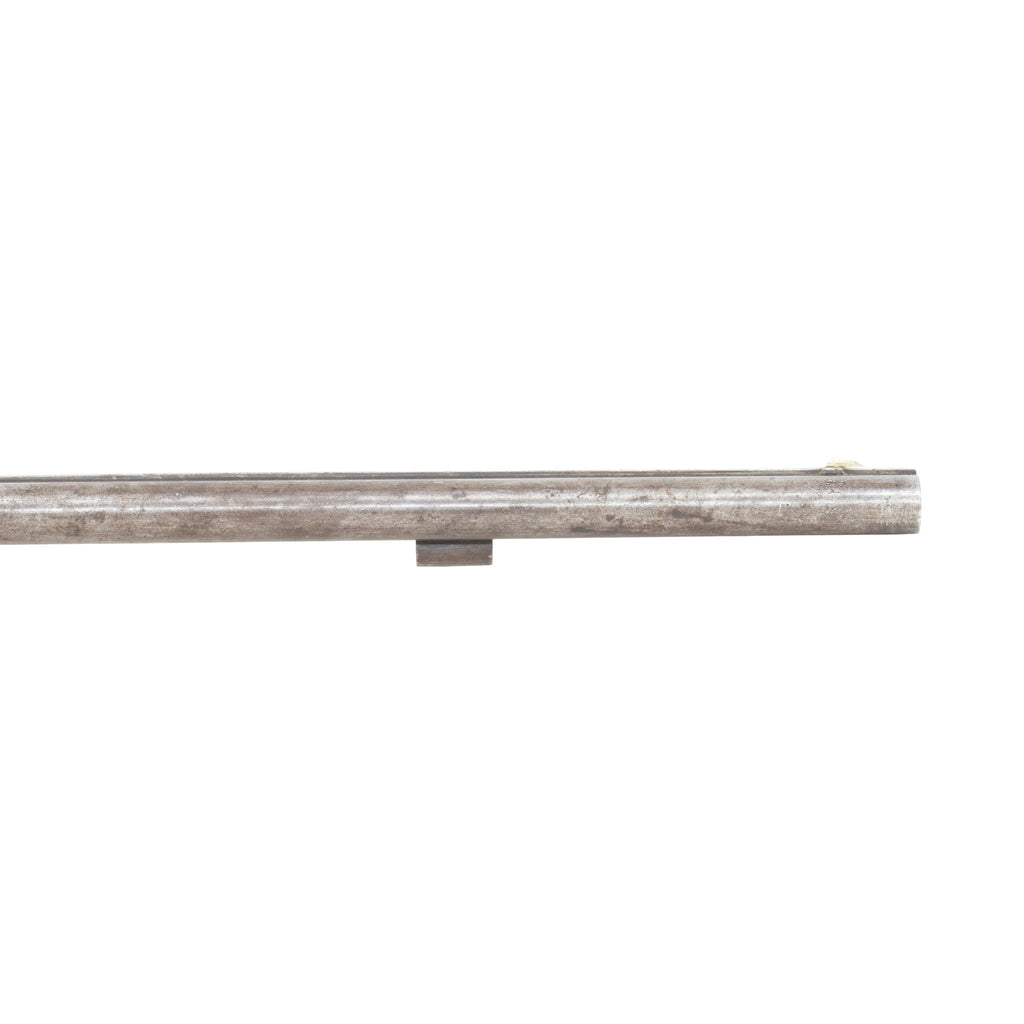 F.G. Fisher double barrel Percussion rifle. Caliber unknown. 32” barrel (believed to have matching bore diameters.) Open sights – front bladed sight, rear sight with elevation adjustment. Barrel is marked F.G. FISCHER, BELLVIEW. Case hardened, hammers, lock and trigger guard feature scroll engraving and ornate motifs. Single trigger with adjustment screw. Figural walnut half stock with crescent-shape butt plate. The stock features a comb cheekpiece on the left-hand side. Ferdinand G. Fisher was a firearms manufacturer in Bellevue, Jackson County, Iowa circa 1860-1870. Bellevue is right on the Mississippi River, a few miles below Dubuque. He previously worked in Rock Island, Illinois, and later worked in McGregor, Clayton County, Iowa. Manufactured 1860-1870. Condition The rifle is mechanically functional and in fair condition cosmetically. Ther rifle contains little if any of the original casehardening and bluing. It has developed a brown patina consistent with age. There is minor manipulation to the screw heads found on the lock, tang, and trigger guard but it is not distracting. There is one screw missing in the upper tang. The bore has not been checked for condition (requires a borescope.) The barrel shows signs of period use (dings, and nicks.) Removing the barrel from the stock reveals a modern repair to the area where the key passes through the barrel attachment. The barrel key may be a replacement. The rifle is missing its ramrod. The walnut stock shows signs of period wear (dings, scuffs scratches.) There is one period chip in the stock on the right-hand side near the lock plate. The brass patch box is fully functional.