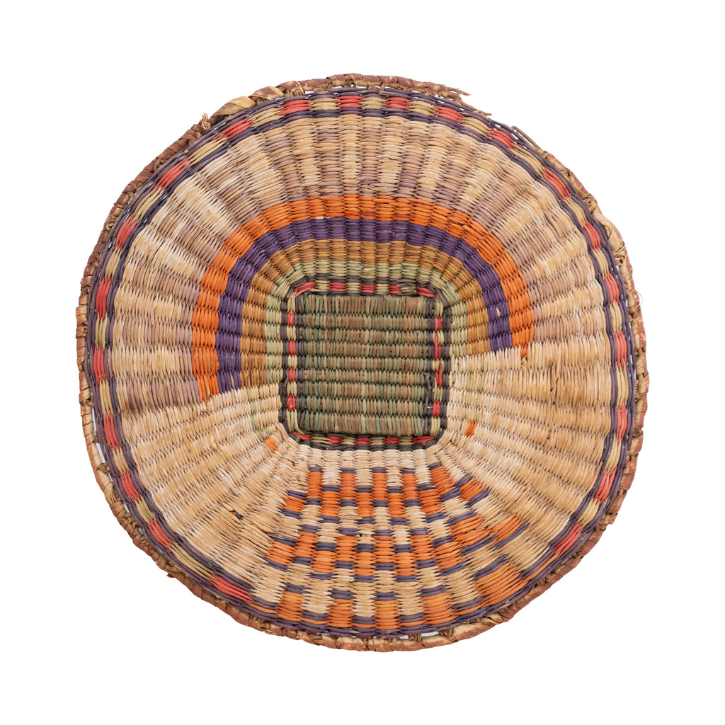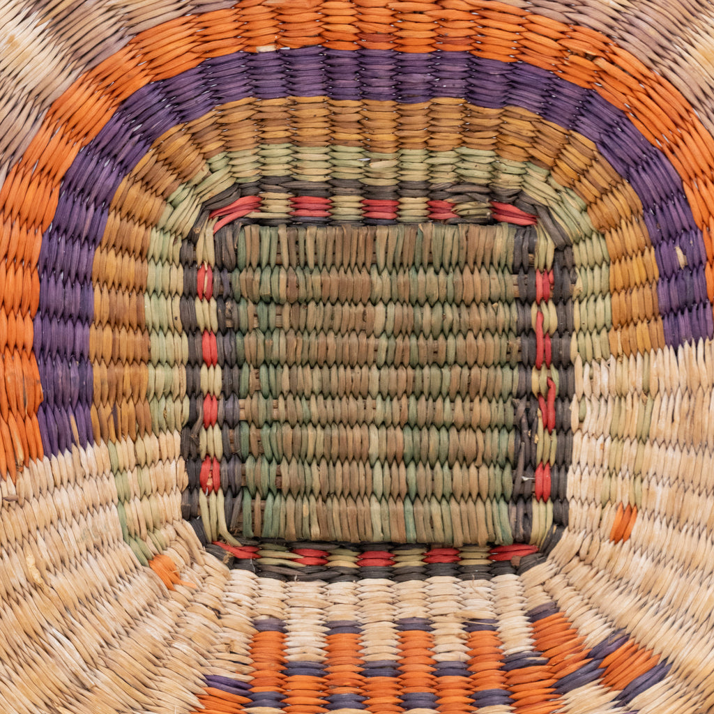 Hopi Third Mesa wicker pictorial plate with kachina face. Minor rim wear not distracting, bright colors.