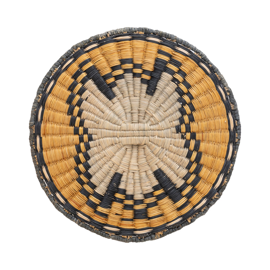 Hopi wicker plaque with butterfly design. 9"D. Back bright, front slightly faded.