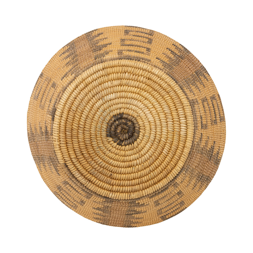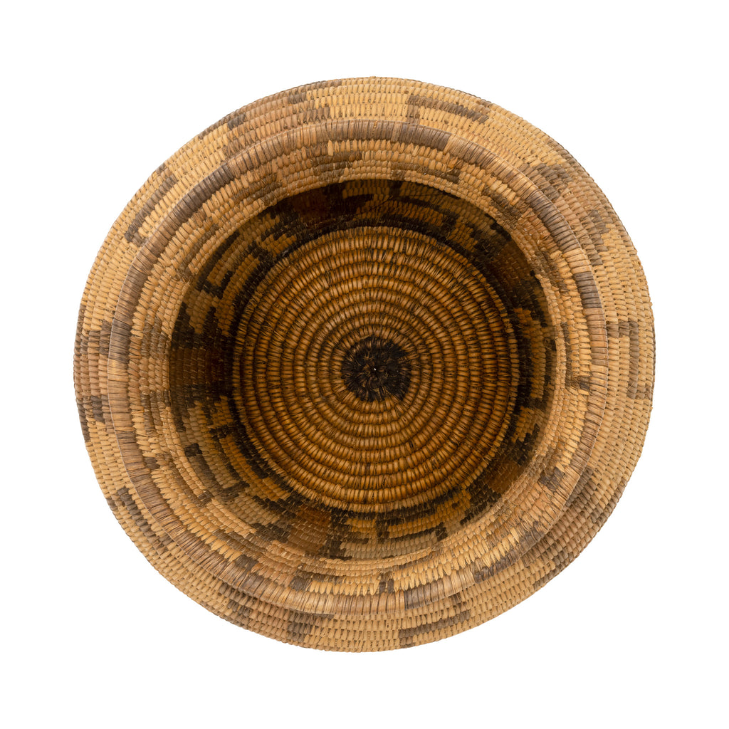 Pima Akimel O'odham polychrome basketry jar; 10"D x 9"H. Circa 1900.