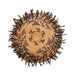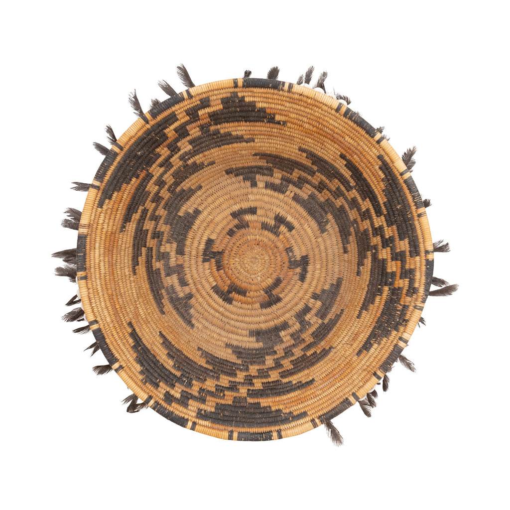 Pomo gift basket with flared trim, having terraced triangular designs and dotted with shell beads. Covered in red feather tufts and quail fobs. Ex. Emily T. and Adolphus Andrews Collection. 3"H x 9"D