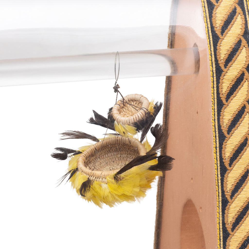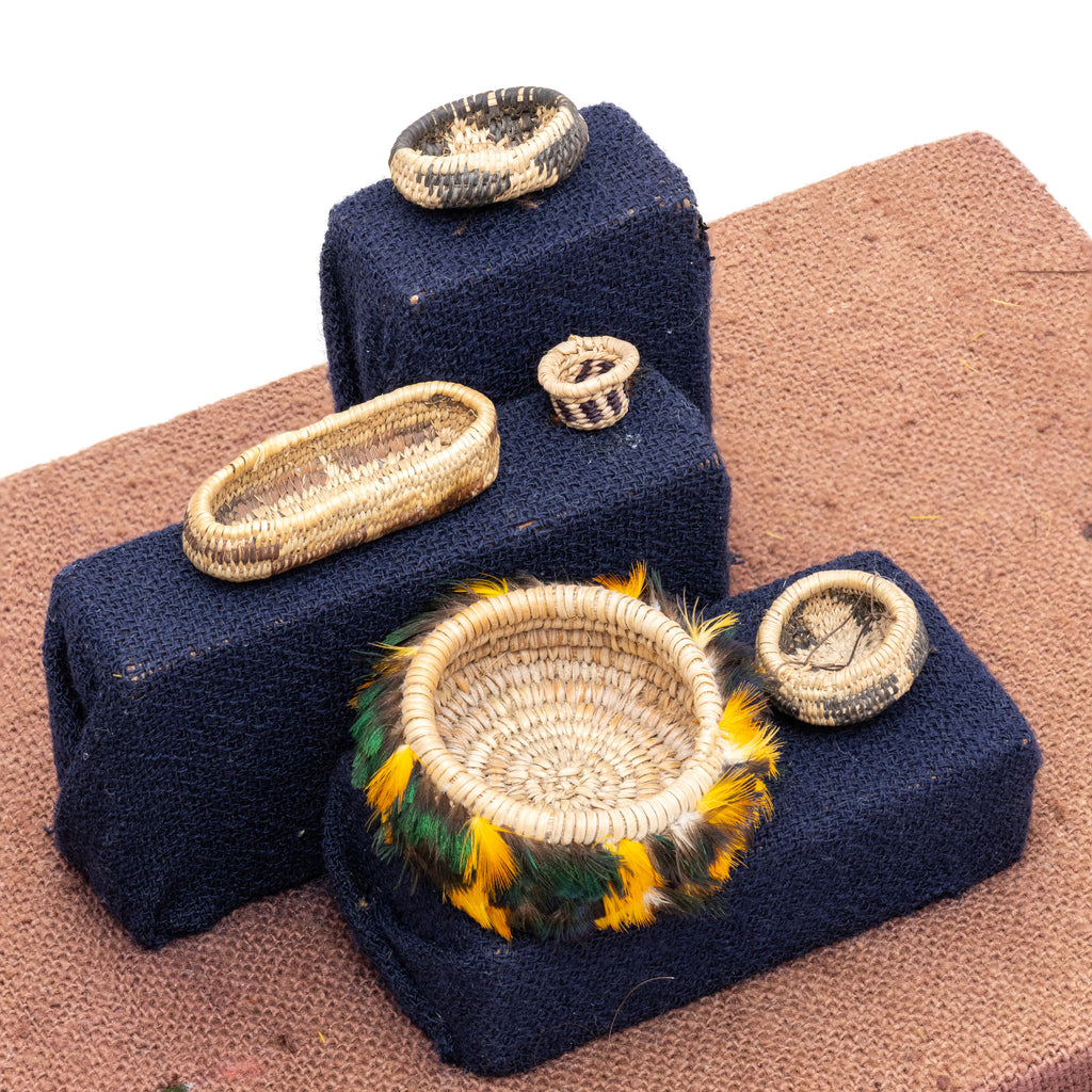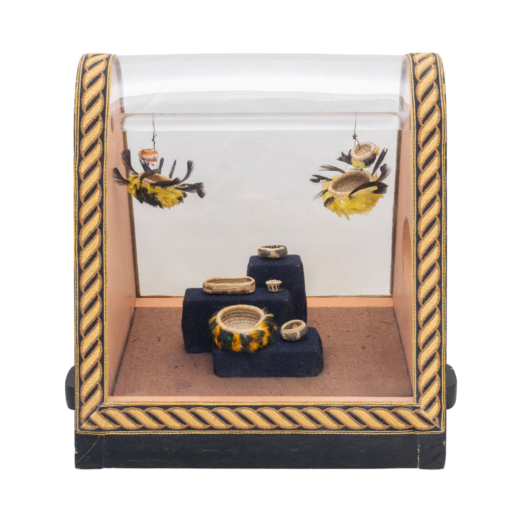 Collection of nine Pomo miniature baskets ranging in size housed in a vitrine with magnifying glass. Ex. Emily T. and Adolphus Andrews Collection. 2" to 3/8", vitrine 10 1/2" x 13"W x 7 1/2"