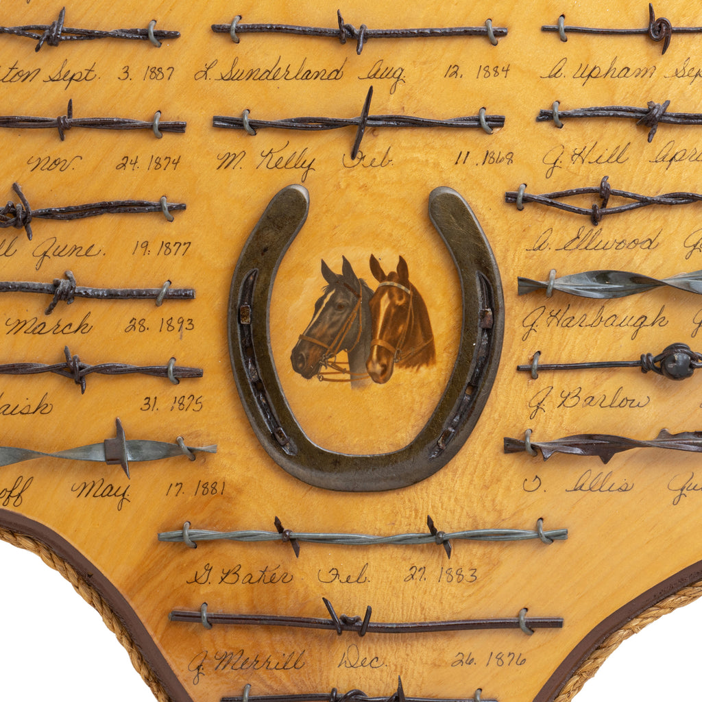 Texas-shaped display featuring various types of barbed wire labeled with patent dates, and a horse head within a horseshoe. 24"H x 26"W x 1D