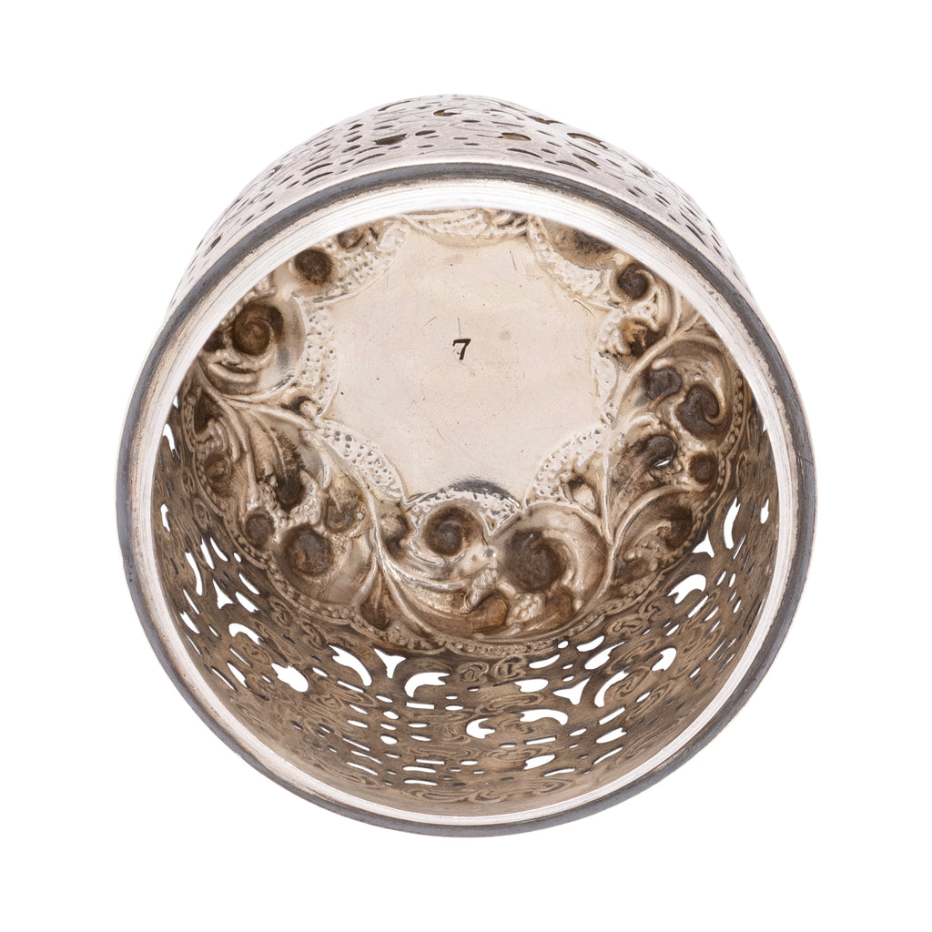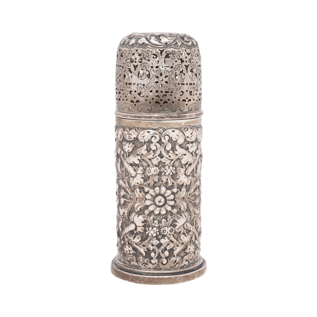 Victorian era, ca. 1888 CE. A handsome sterling silver muffineer with a tall cylindrical body, richly chased in high-relief scrolling foliate motifs over a dense stippled ground, and topped by a pierced, domed screw cap for neat, controlled sprinkling of sugar or other seasonings. The bright silver surface catches the light across the raised ornament, while the openwork lid and snug threads speak to careful Victorian tableware engineering. Both the lid and the base share 5 hallmarks: lion passant silver standard mark; uncrowned leopard head for the London city mark; E. F over H.T. into a shield, for the maker Horace Woodward & Co Edgar Finley & Hugh Taylor; date letter N for the year 1888; Queen Victoria head in profile duty mark. 2 1/2"W x 6 1/4"H, 151.8 grams