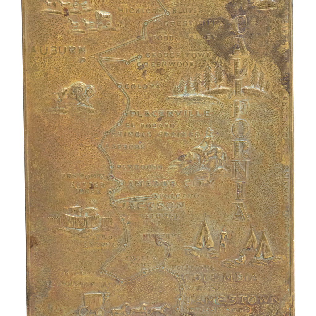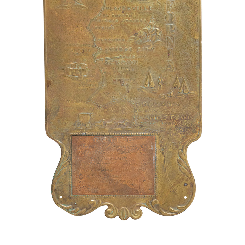 Wells Fargo Company brass door push. Titled "Wells Fargo Company's Stage Express Routes." It depicts map like illustration of the stops along the line from Nevada City to Coulterville, California. Embossed brass with copper notice on bottom left hand corner, reading "Max 9 passengers, 3o dollars- 30lb for extra baggage. No firearms inside. No persons with any disease inside. No spitting from Windows." Authentic, early piece with great patina.