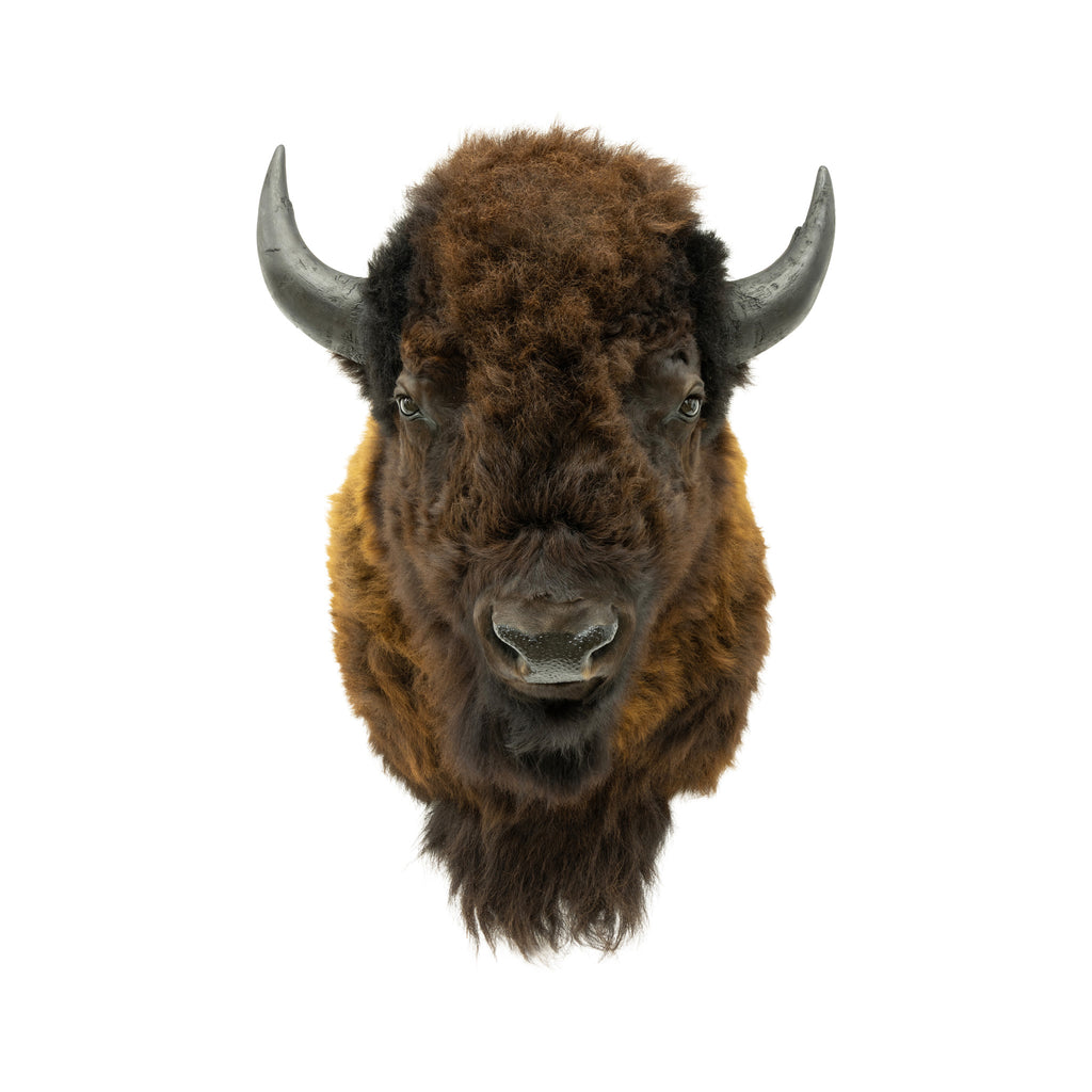 Wyoming buffalo bull shoulder mount. Original horn caps. This fresh mount was grazing in the yellow hills near Yellowstone in December 2025. 26" horn spread, 45" top to bottom, protrudes 38".