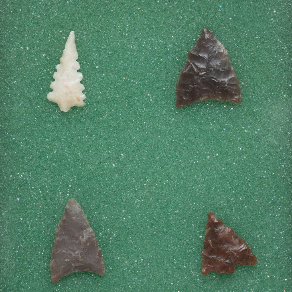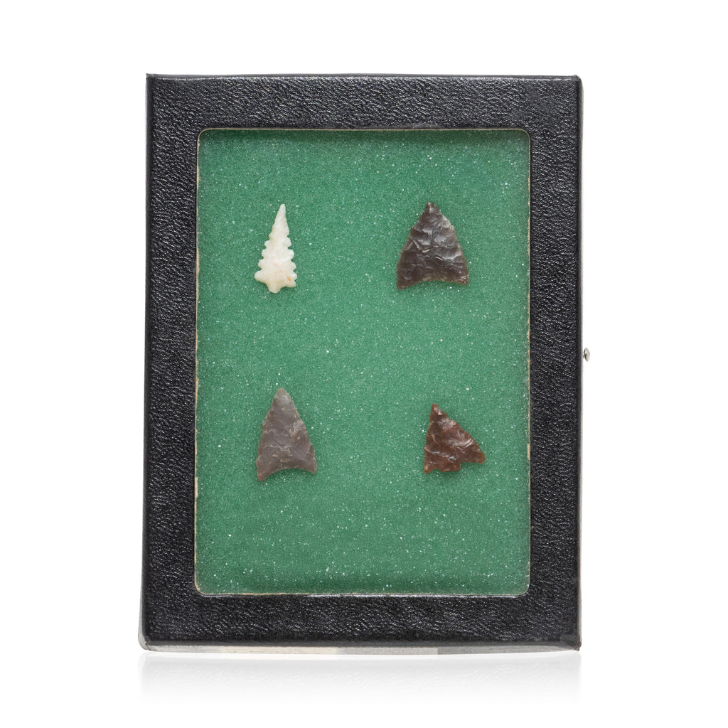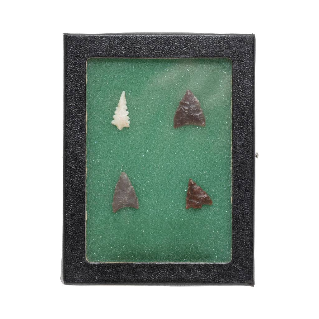 Collection of four prehistoric bird points. Collection history noted “No. Rockies, Lewin Collection.” Largest ½”, 3" x 4" Riker frame. Ex. Hank Johnson Collection. Hank Johnson was a geologist, and passionate collector of historical and ancient artifacts. Starting with relics and bottles from ghost towns, he later focused on Anasazi pottery and Pre-Columbian. He worked with the Denver Art Museum to verify authenticity, building a respected reputation in the collecting community. View the entire Hank Johnson Collection under Special Collections “Johnson.”