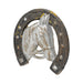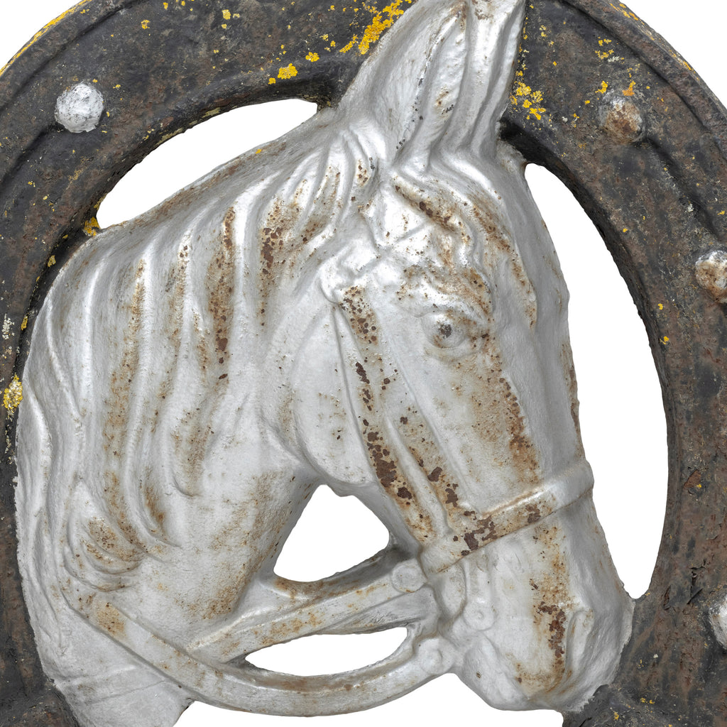 Antique French cast iron horse and horseshoe trade sign. Back filled with cement. 27 1/2"H x 26 1/2"W