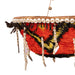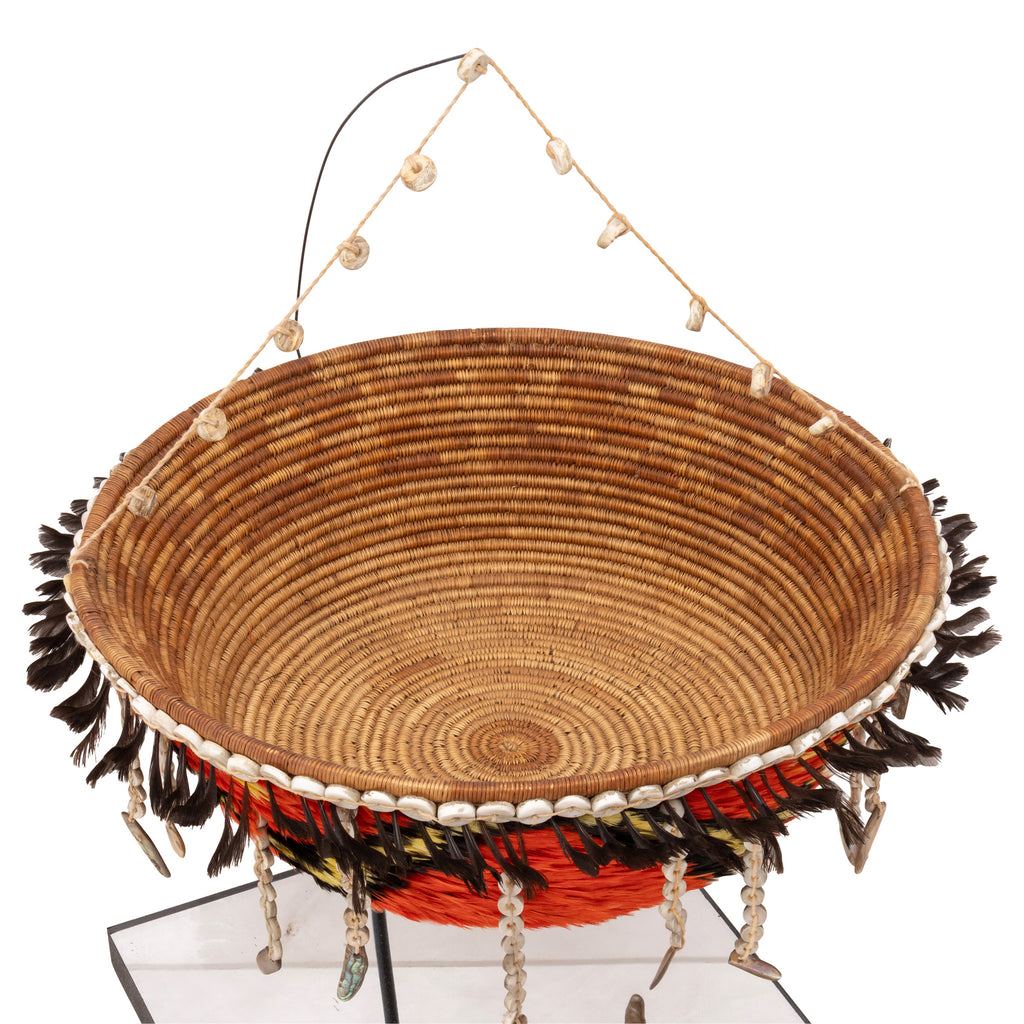 Exceptional fully feathered Pomo gift basket with red, black and yellow. Shell drops with abalone pendants and shells around rim, adorned with quail fobs. String for hanging. Very tight weave. Resting on mirrored stand to accentuate bottom of the basket. 7" x 7", top of string 14". Under the name Pomo are some 30 small tribes. The tribes which made these baskets live in Lake Sonoma and Mendocino counties, and are examples of their best work. The materials used are California sedge, nut pine, black rooted sedge, Sitka willow, Douglass spruce beaked hazel, California flax, red fir, poison oak, bracken, bullrush, nutmeg, Oregon grape, syringa, maiden-hair fern, digger pine, green briar, willow, redbud, bracken, calycanthus and hazelnut.