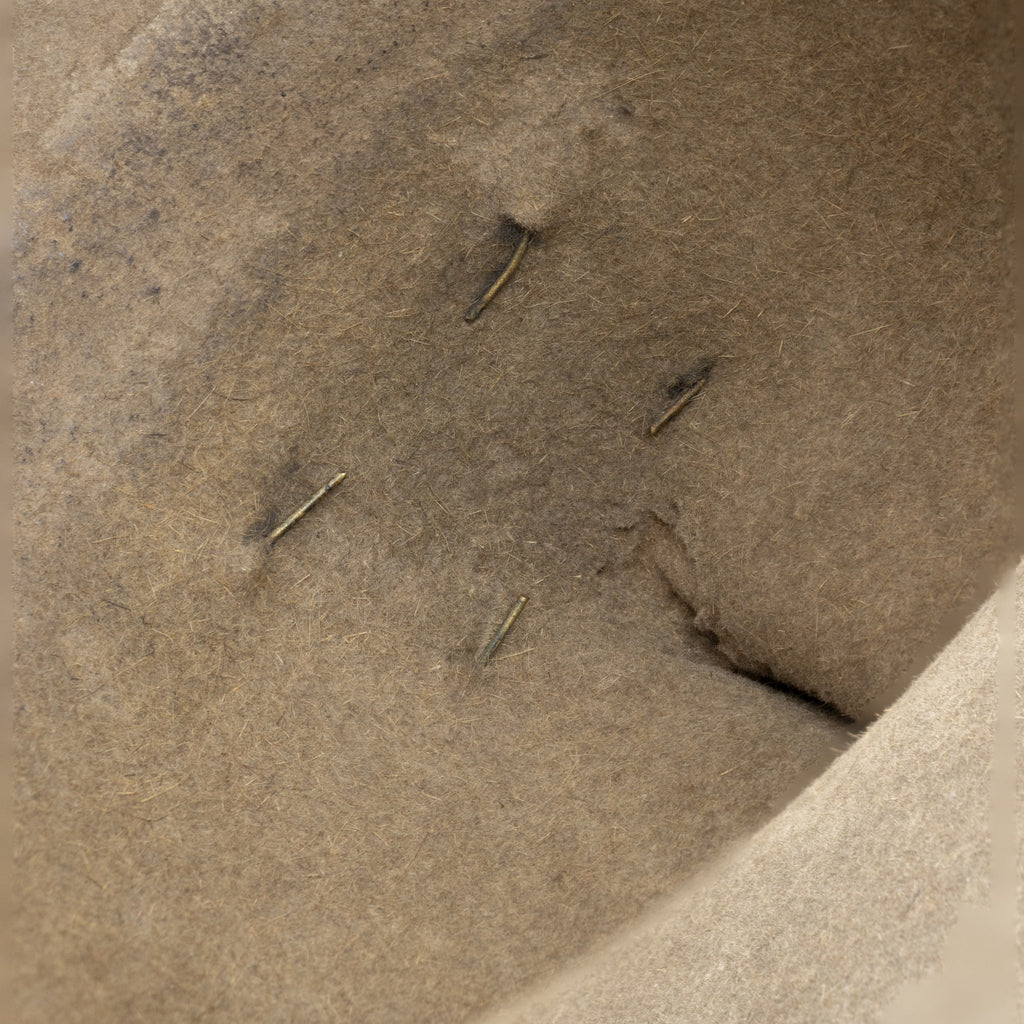 19th Century Montana Peak cowboy hat with USS Indian Scout insignia pin. Wool felt, wid brim, braided leather band over original, and tall peaked crown, having USS Indian Scout insignia pin for the Indian Wars. Remnants of leather chin strap on interior. Ex. Ken Hanna. This one was "there." 4" brim, larger than most size 7 1/2.