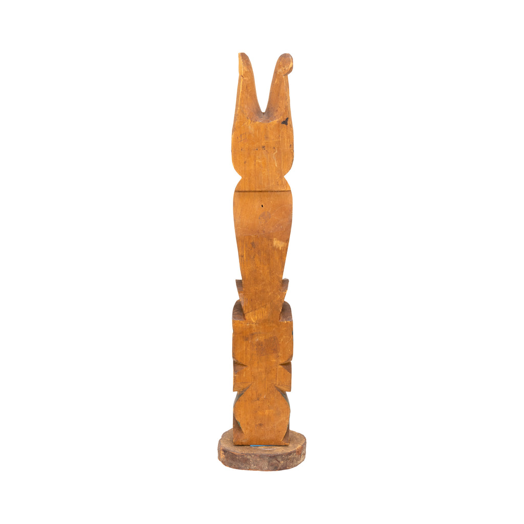 Nuu-chah-nulth thunderbird and bear model totem pole. Features a thunderbird over a bear totem, circa 1930s. The base is a round cut of alder. Please note the wings of the thunderbird are missing and there is damage to the ears. Sold as-is.