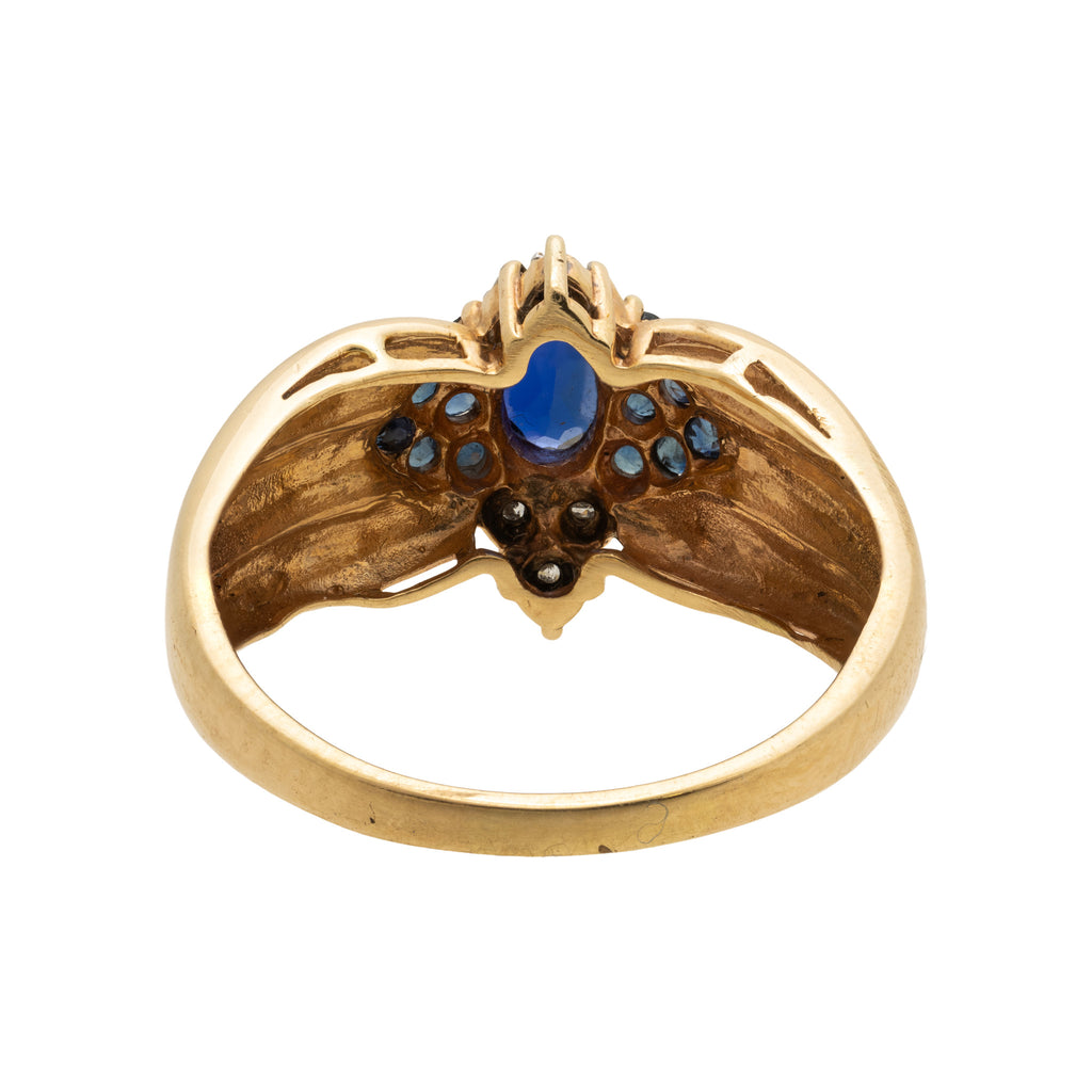 10k gold diamond and natural sapphire ring. Central oval cut sapphire with ten small sapphires and six small natural untreated diamonds arranged in halo setting on thick brushed gold band.