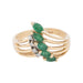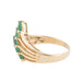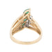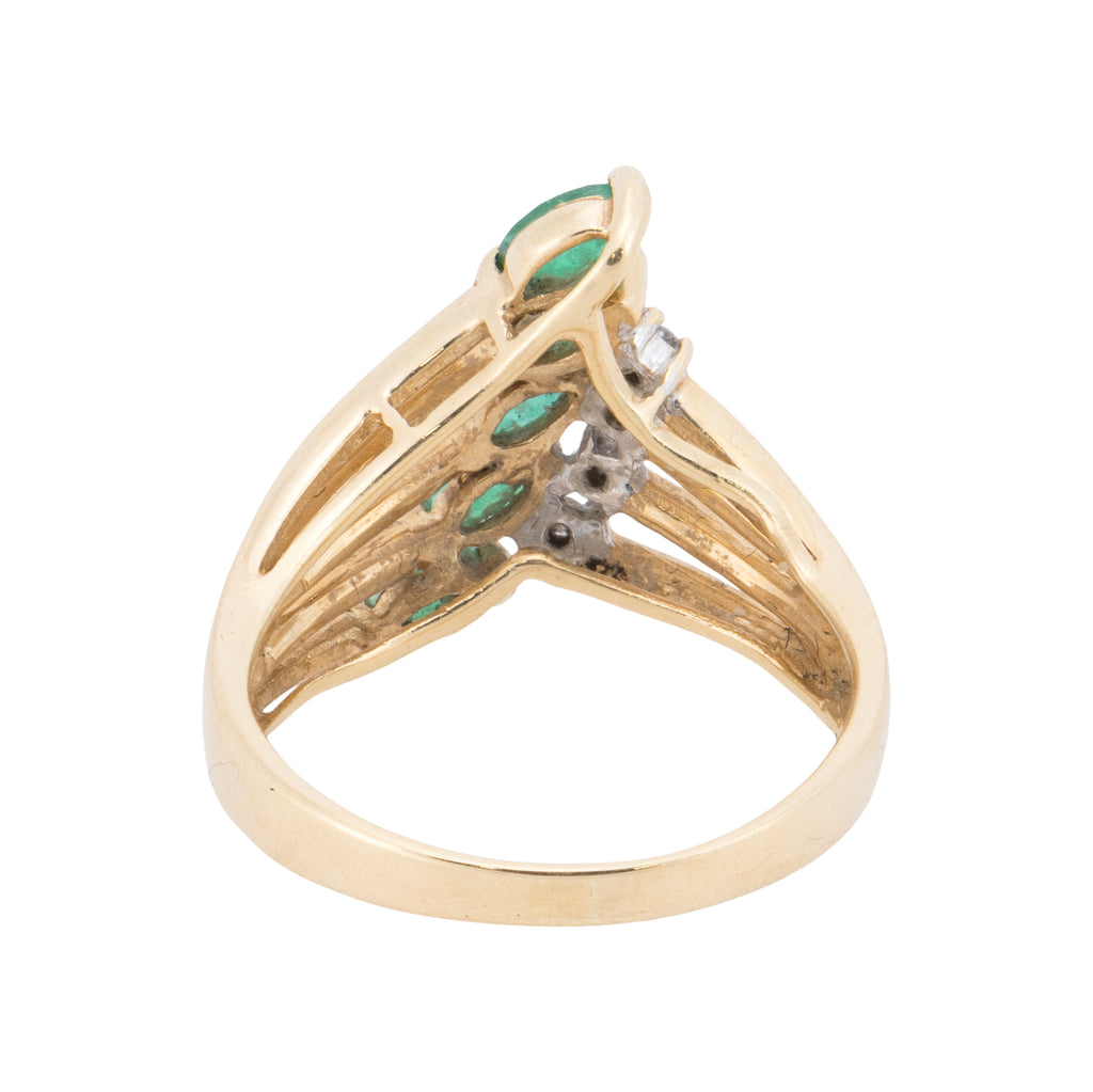 14k yellow gold and emerald ring. Five natural marquis cut emeralds arranged in a gentle diagonal line with four complementary natural mined diamonds. Each stone has its own individual shank that merges into one band on the back of the ring.