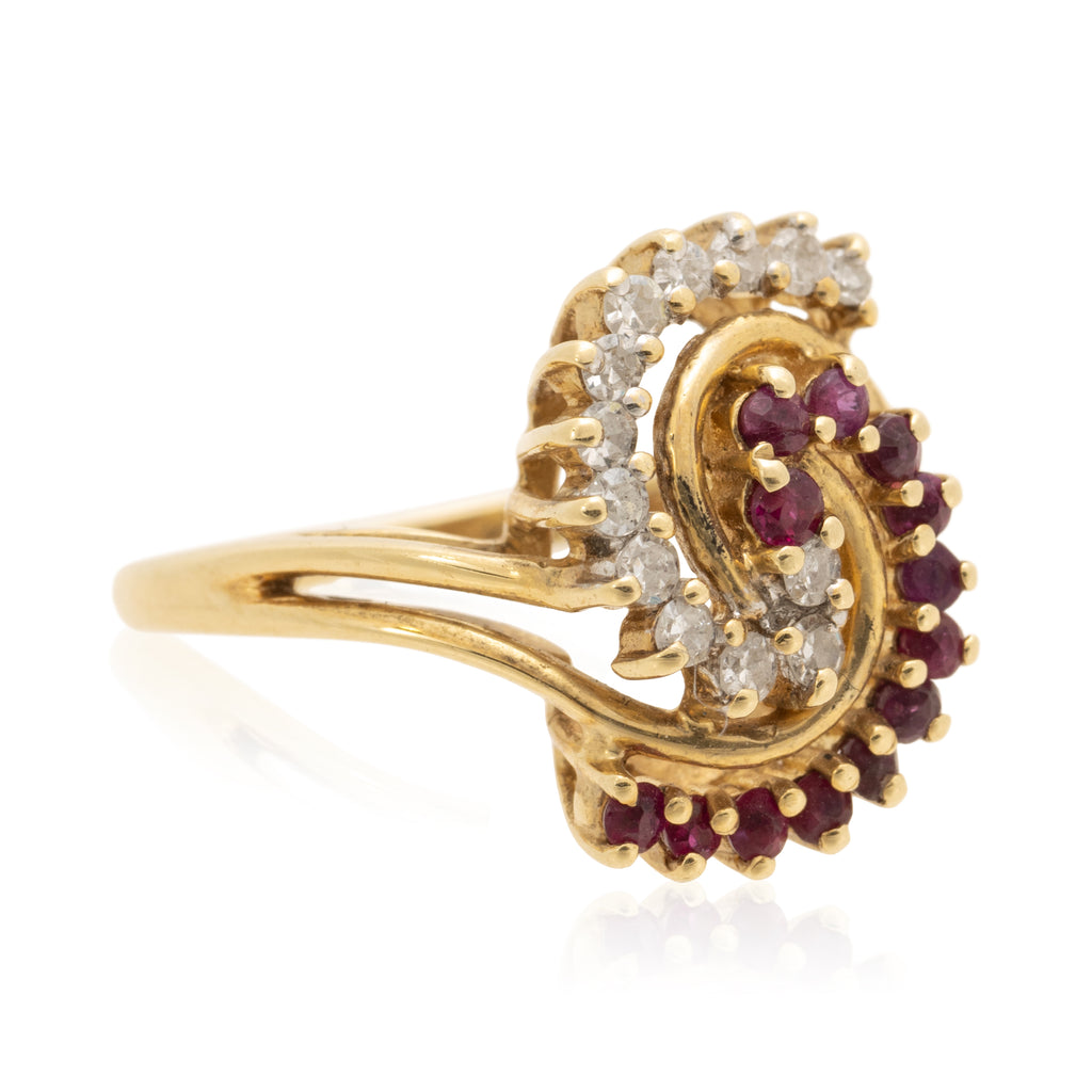 14k gold diamond and ruby ring with 12 natural rubies and 13 natural mined diamonds arranged in a swirling illusion setting on split shank band.