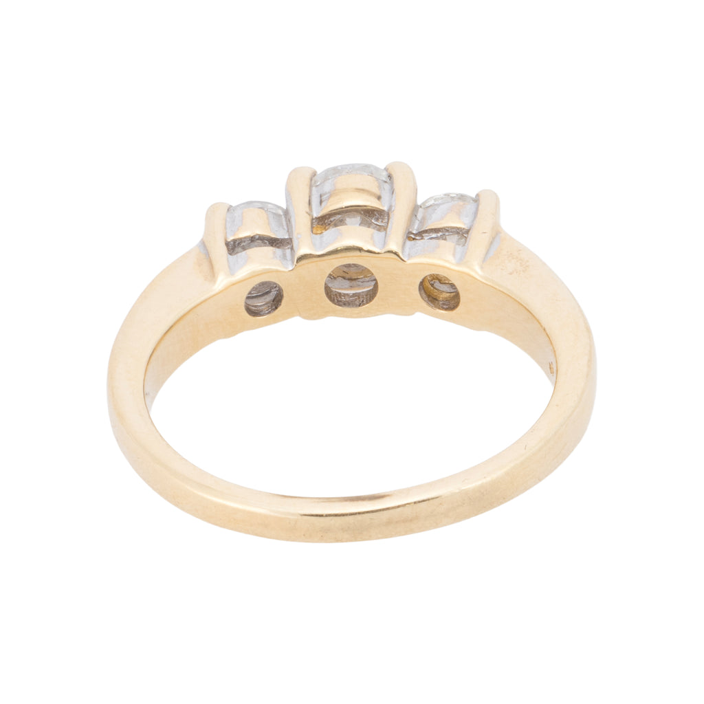 14k yellow gold ring .9 carat natural mined diamonds. Three round diamonds set in a simple band.
