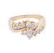 14k yellow gold and 1 carat natural mined diamond ring. 11 diamonds set in swirling cluster on thick yellow gold band.