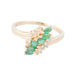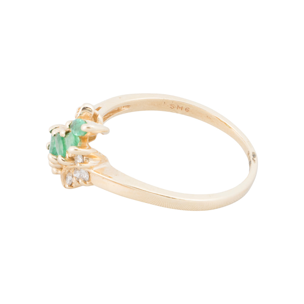 14k yellow gold emerald ring. Six natural mined marquis cut emeralds arranged in diagonal cluster with eight small diamonds on either side.
