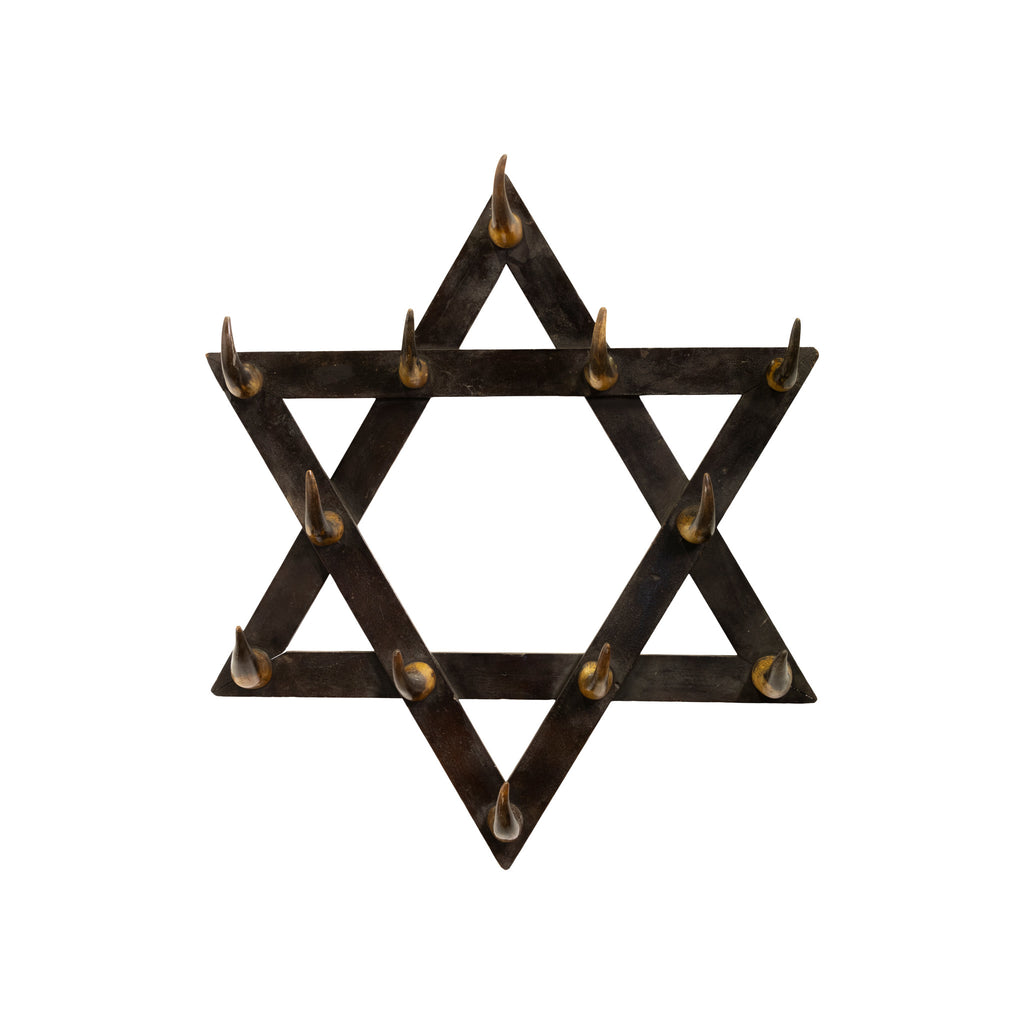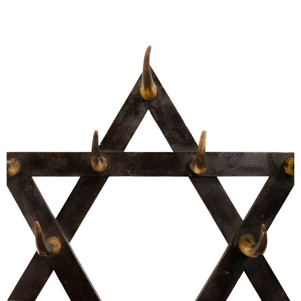 12 horn adirondack gun/hat rack in six pointed star design. 12 steer horn hooks. Came from a hunting lodge in Maine. 29" x 31"