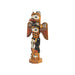 Alaskan black diamond hand carved totem pole from Alaskan Native yellow cedar. Not Native carved but remains highly collectible. Features motif from a legend of "Fog Woman." On the undersigned it is signed by "Patrick Seale" and includes a small pamphlet with the legend that reads: The Legend of Fog Woman - Raven and his two men wre fishing in a canoe. They had travelled further out in the water than they had ever gone before. Soon they were engulfed by a dense fog. The fog was so dense that the trio lost their balance and did not know where they were. Suddenly, on the bow of the canoe appeared a beautiful woman. "I will show you the way to my village and to safety," she said. Of course, Raven and the men followed her. After a short time, Raven fell in love with Fog Woman, and they were married. They were very happy until a food shortage befell the village. Everyone was short of food except Fog Woman, who always had plenty of salmon in her cooking pot. Being a very curious creature, Raven follows Fog Woman to the creek. There he witnesses her swirl her fingers in the water and out jump beautiful salmon. He asks how she makes this happen, but she won't tell him. Raven grumbles and returns to the village. Again, Raven asks how she produces the salmon. She refuses to tell him. This time Raven says "If you won't tell me, then be gone!" At this she turns into Fog and rolls out to sea calling "I will come to you only as Fog, but I will return salmon to the streams each year so you and the village will have plenty of food." That is how we get Salmon and Fog today. This hand carved totem is made of old growth Native yellow cedar grown deep in the rain forests of Southeast Alaska.