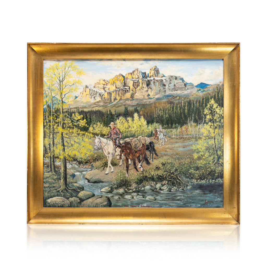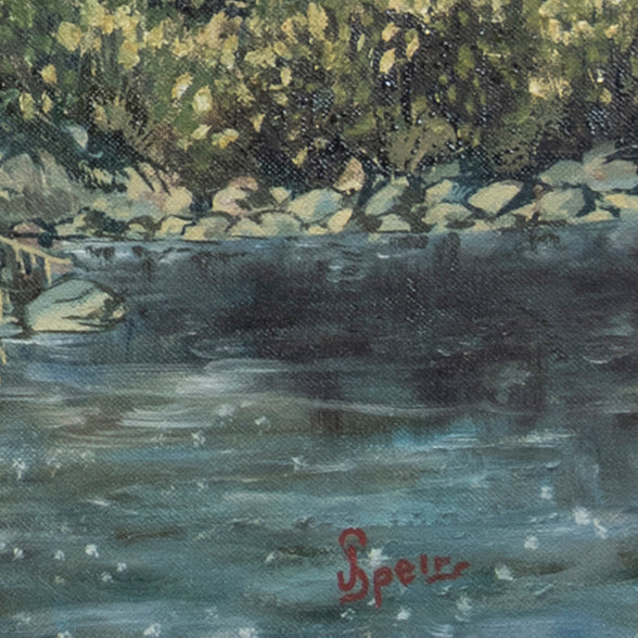 Amid Majestic Grandeur by John Speirs. Signed. Oil on board, 25" x 30". J. studied in London after graduating in Stratford. He was a teacher who set up an art program in St. Catharines. He primarily focused on painting after retirement. 42 of his works have been displayed at the Ingersoll Creative Art Centre (Bureau). He has painted over 500 works selling often to buyers in Toronto and St. Catharines.