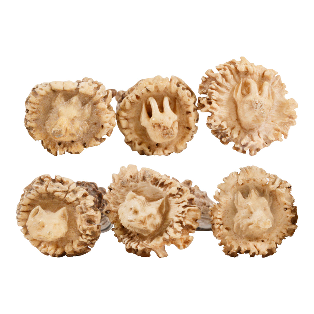 Six knives and six forks with antler carved figural butts with hounds and stags. German. Forks match knives' handles, but blades different. Priced as a set.